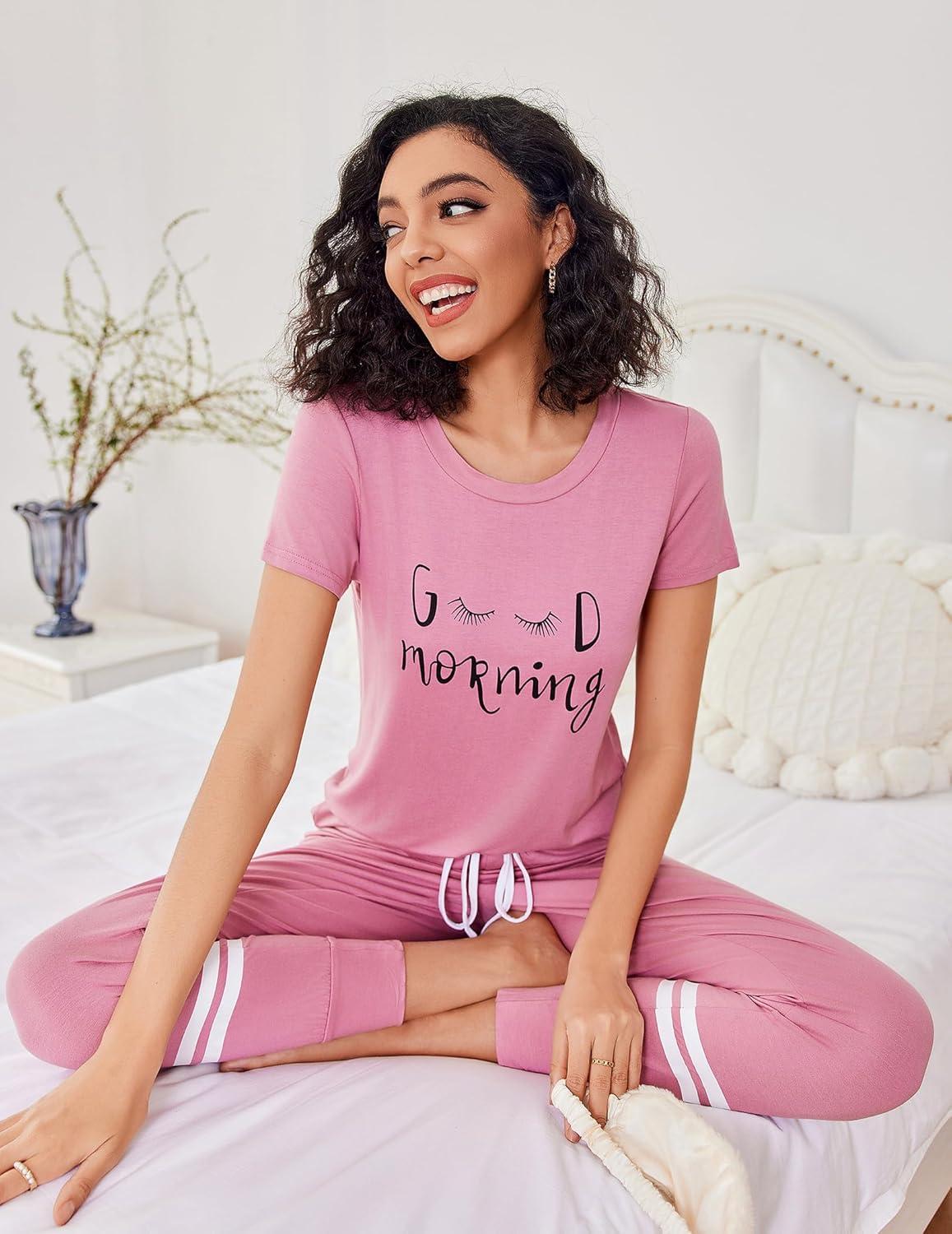 Ekouaer Womens Pajamas Set 2 Piece Lounge Pj Set Short Sleeve Sleepwear Tops with Joggers Pants Loungewear Print Nightwear(Dark Pink)