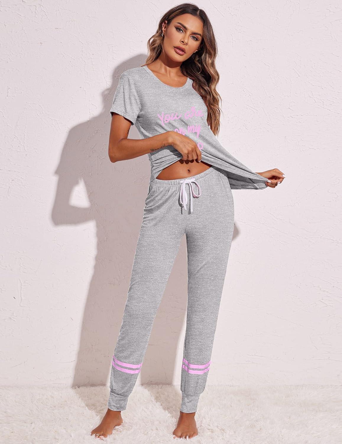 Ekouaer Womens Pajamas Set 2 Piece Lounge Pj Set Short Sleeve Sleepwear Tops with Joggers Pants Loungewear Print Nightwear(Light Grey2)