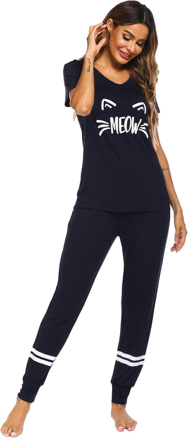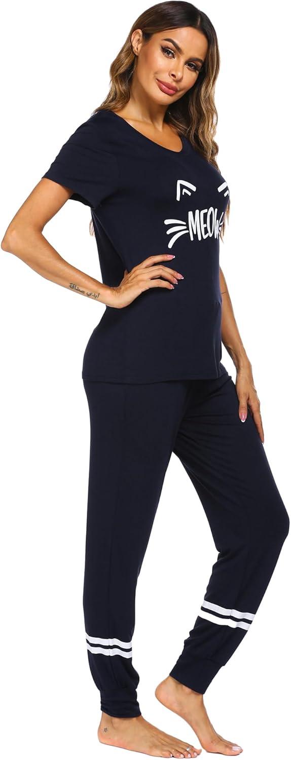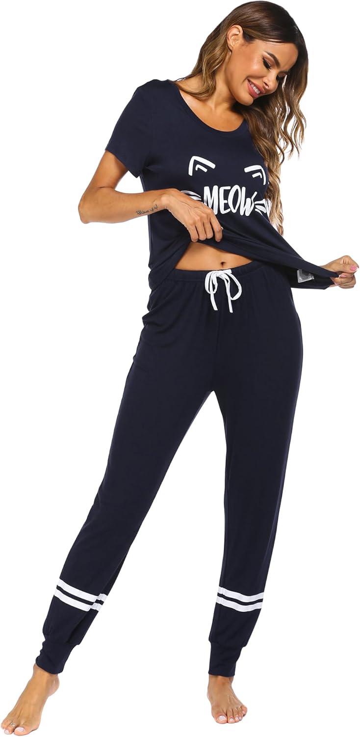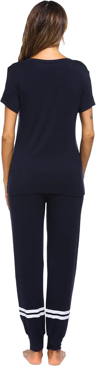 Ekouaer Womens Pajamas Set 2 Piece Lounge Pj Set Short Sleeve Sleepwear Tops with Joggers Pants Loungewear Print Nightwear(Navy)