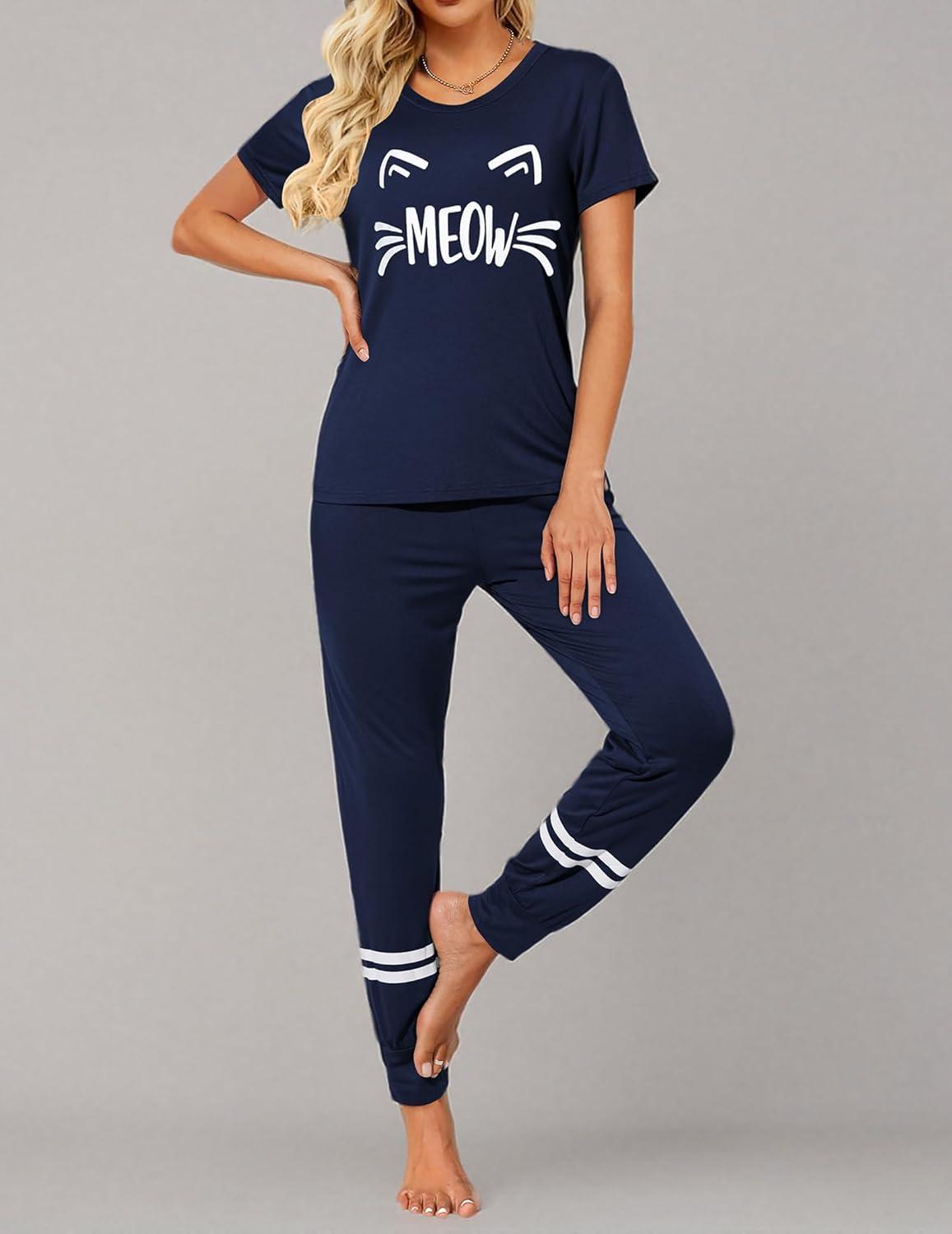 Ekouaer Womens Pajamas Set 2 Piece Lounge Pj Set Short Sleeve Sleepwear Tops with Joggers Pants Loungewear Print Nightwear(Navy Blue)
