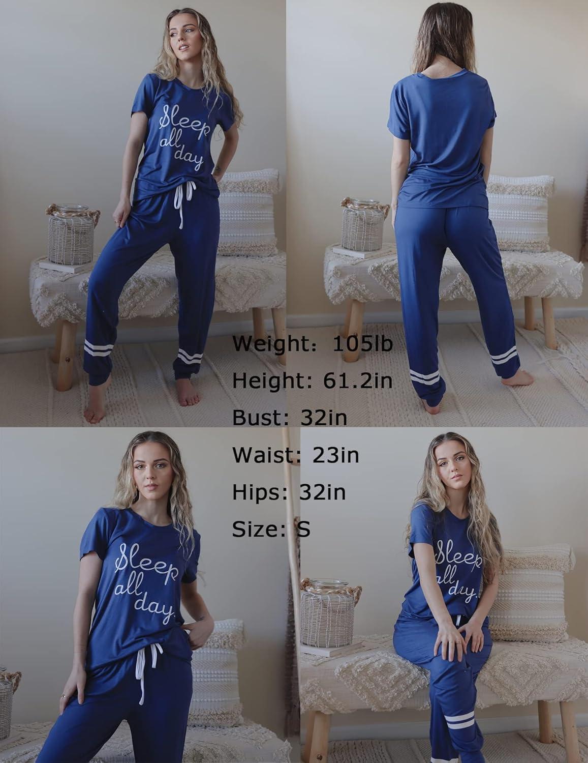 Ekouaer Womens Pajamas Set 2 Piece Lounge Pj Set Short Sleeve Sleepwear Tops with Joggers Pants Loungewear Print Nightwear(Navy Blue)