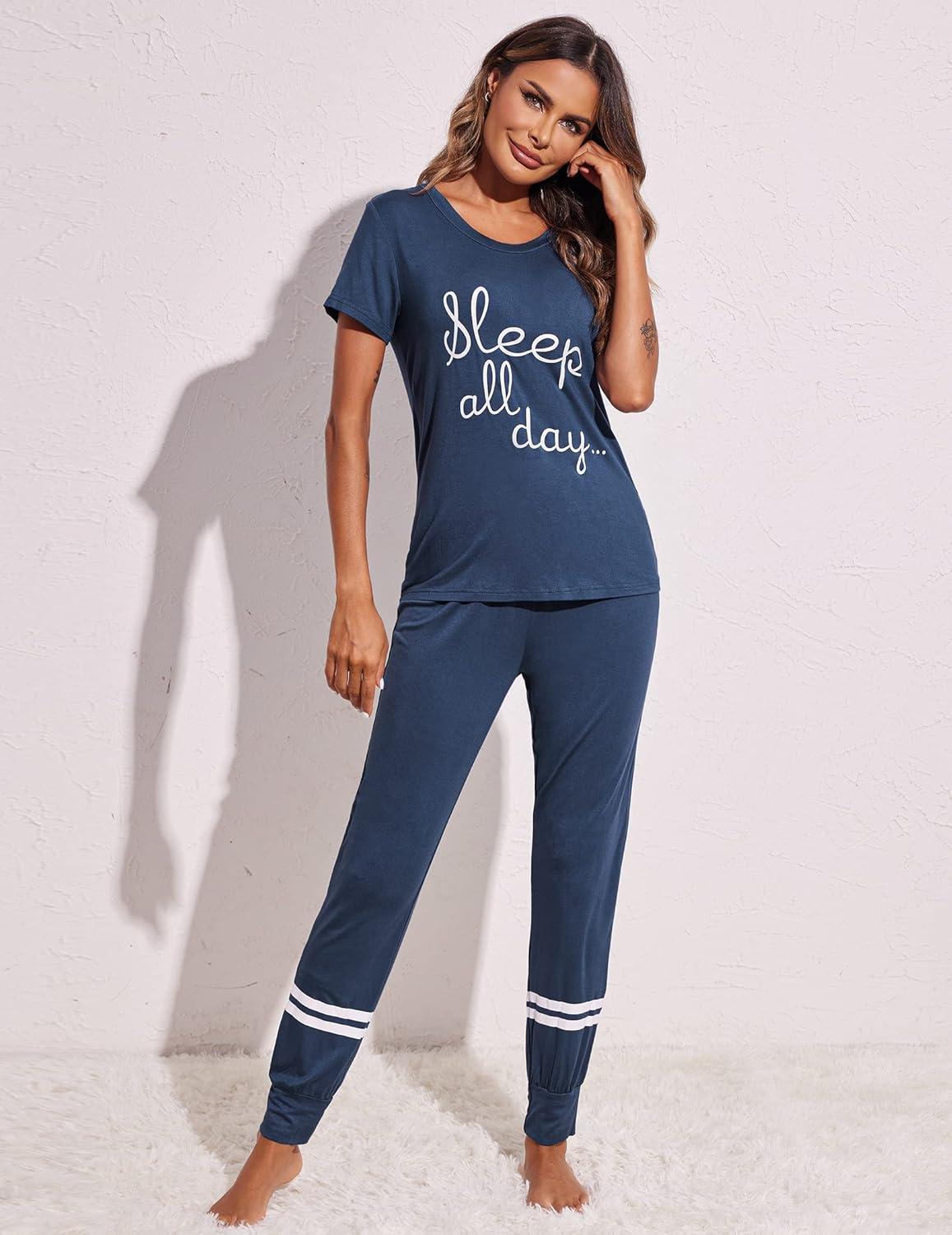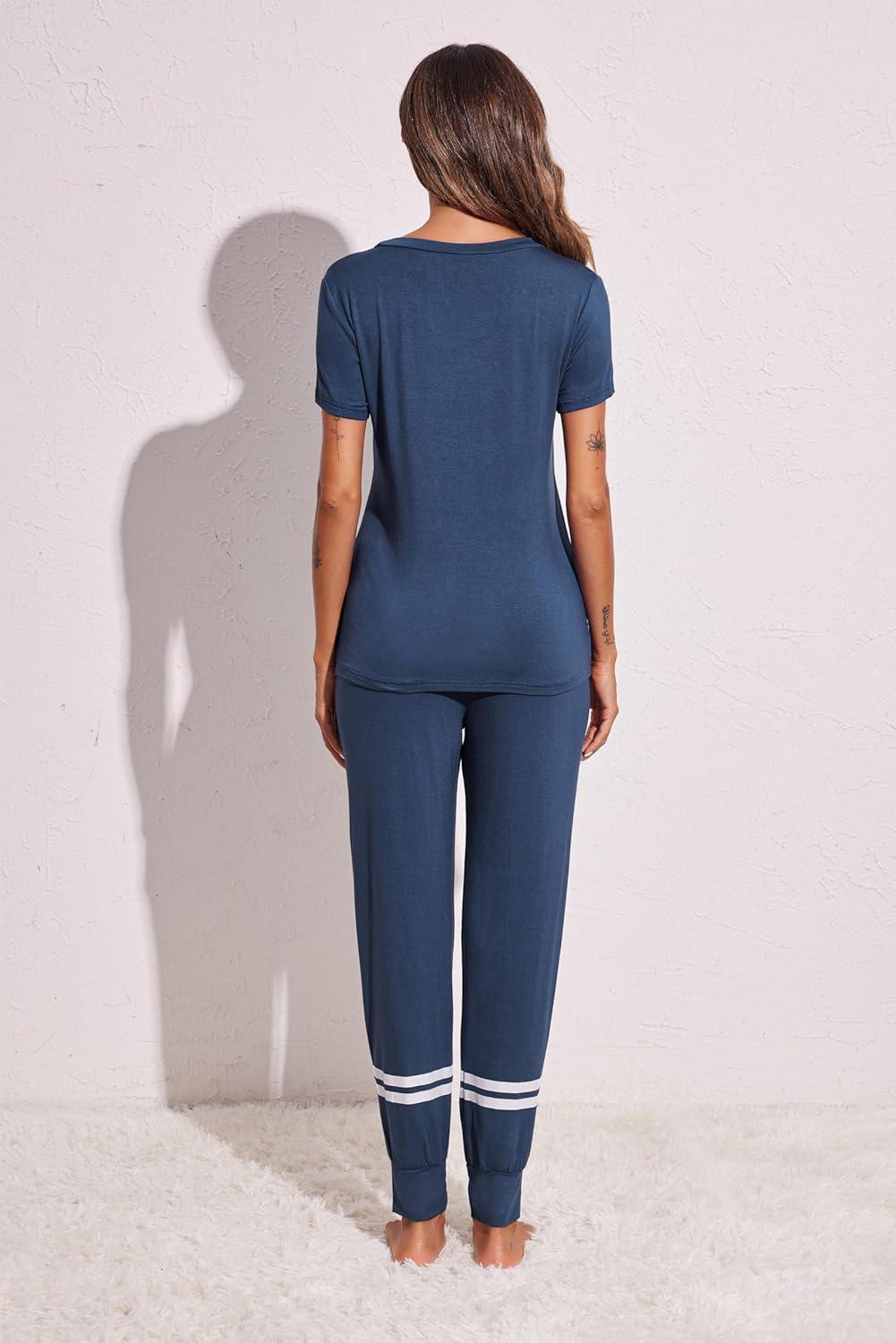 Ekouaer Womens Pajamas Set 2 Piece Lounge Pj Set Short Sleeve Sleepwear Tops with Joggers Pants Loungewear Print Nightwear(Navy)