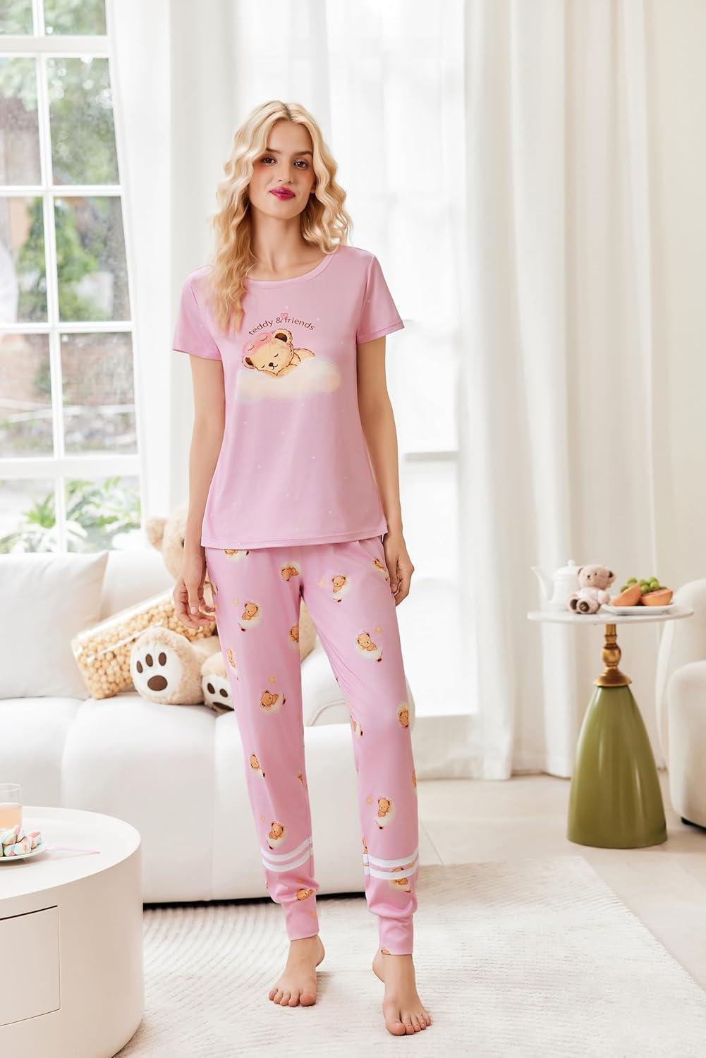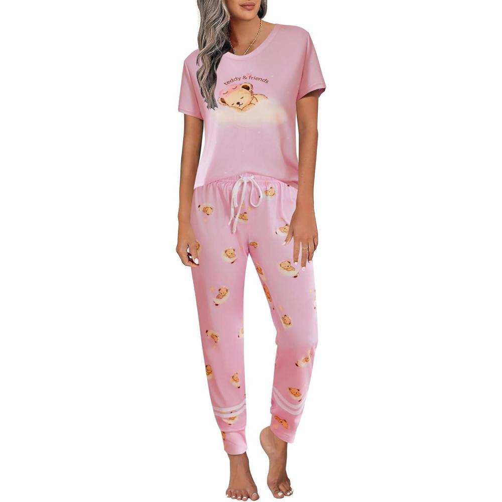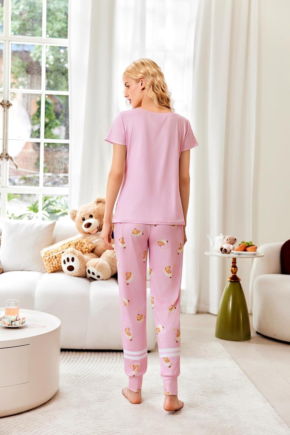Ekouaer Womens Pajamas Set 2 Piece Lounge Pj Set Short Sleeve Sleepwear Tops with Joggers Pants Loungewear Print Nightwear(Pink Teddy)