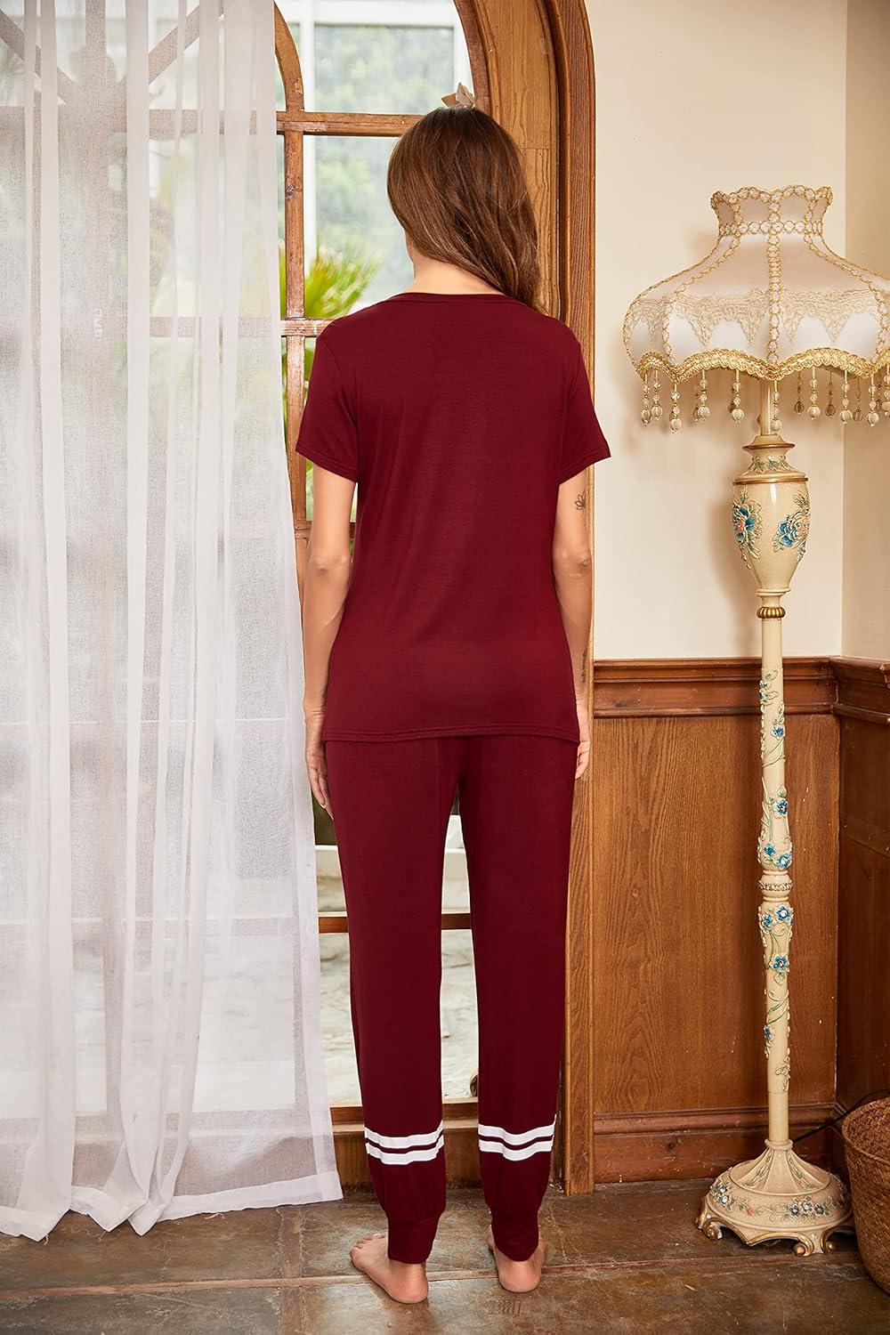 imageEkouaer Womens Pajamas Set 2 Piece Lounge Pj Set Short Sleeve Sleepwear Tops with Joggers Pants Loungewear Print NightwearWine Red