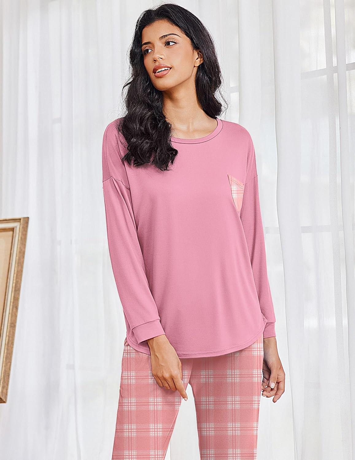 Ekouaer Womens Pajamas Set Long Sleeve Christmas PJ Sets Soft Lounge Set for Women Sleepwear Joggers with Pockets(Light Pink Plaid)