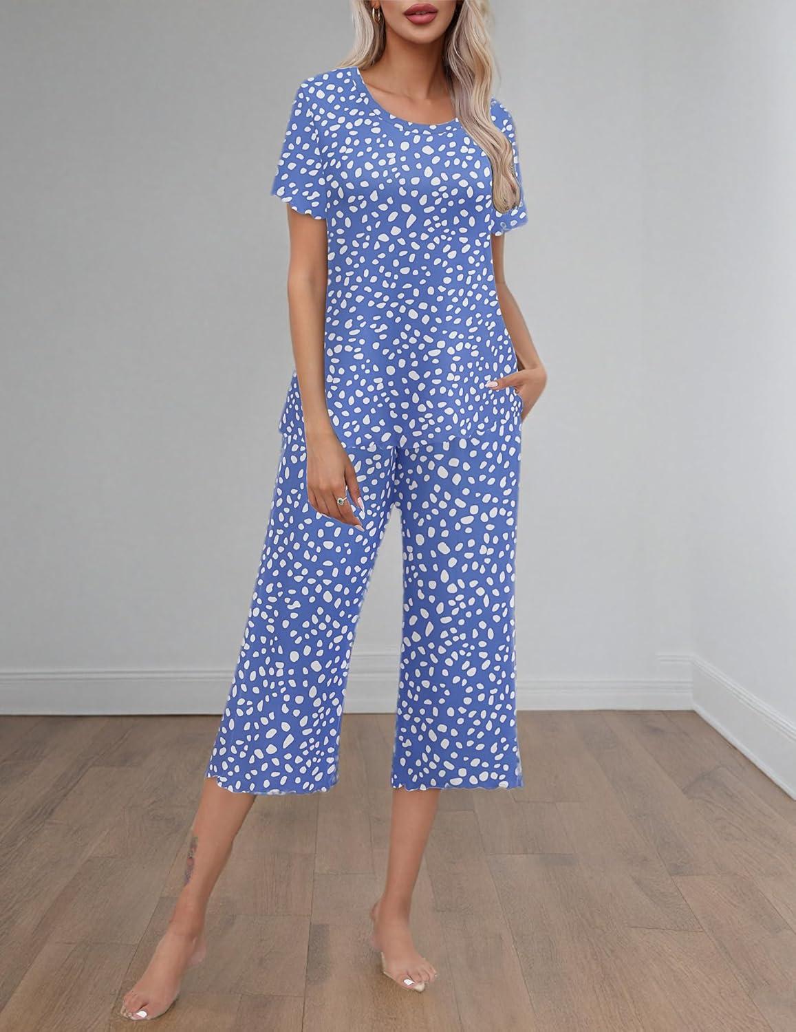 Ekouaer Women's Pajamas Set Short Sleeve Top With Capri Pants Pjs Lounge & Sleepwear Set S_XXL(Blue/White Pot)