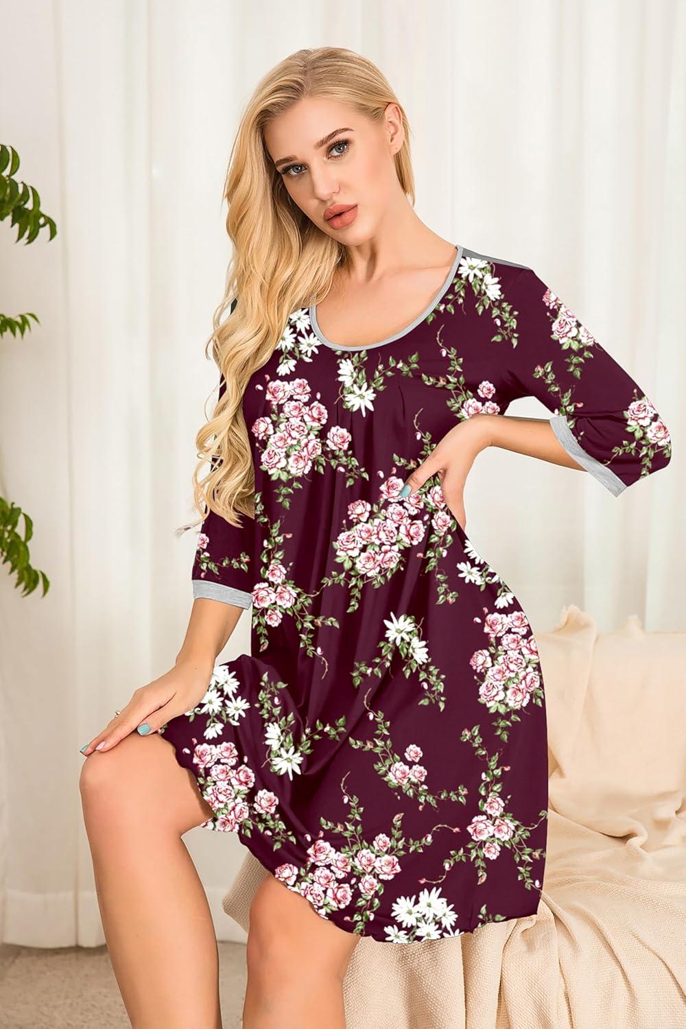 Ekouaer Women's Pleated Nightgown Soft Sleep Shirt 3/4 Sleeve Pajama Dress Scoopneck Sleep Tee Nightshirt Sleepwear S-3XL(Floral Wine Red)