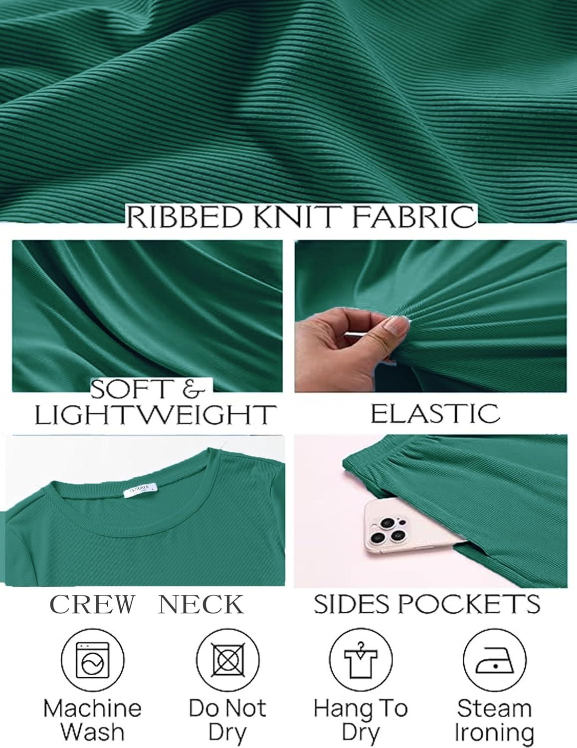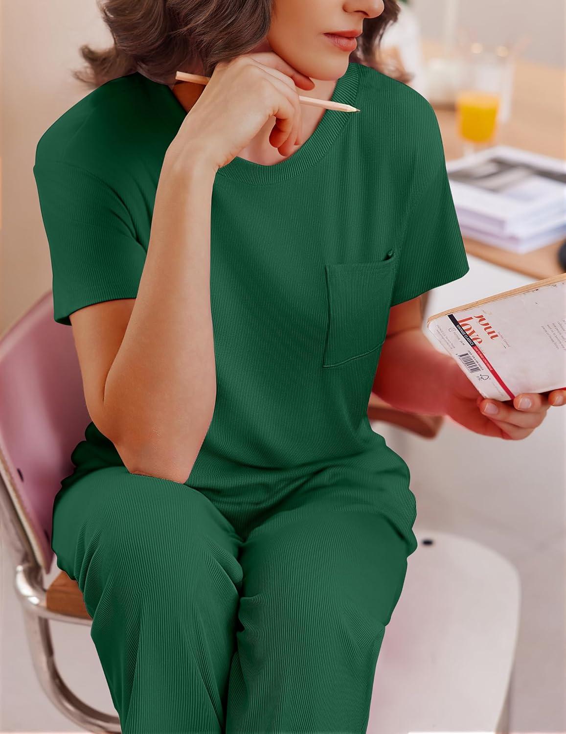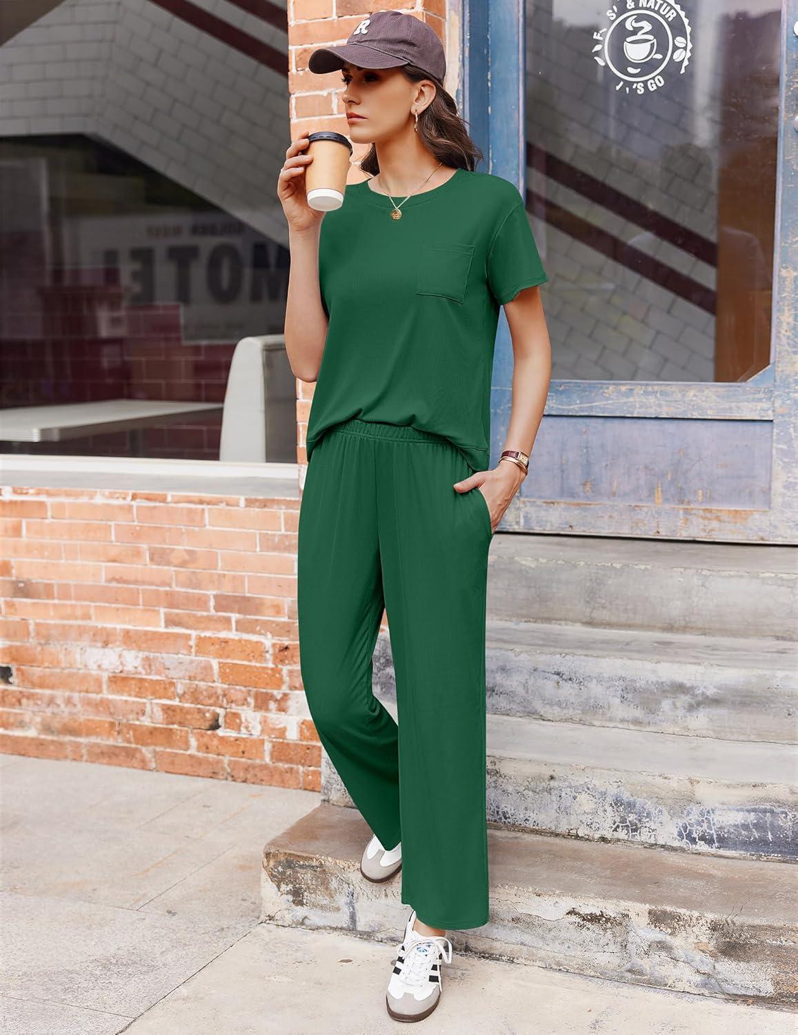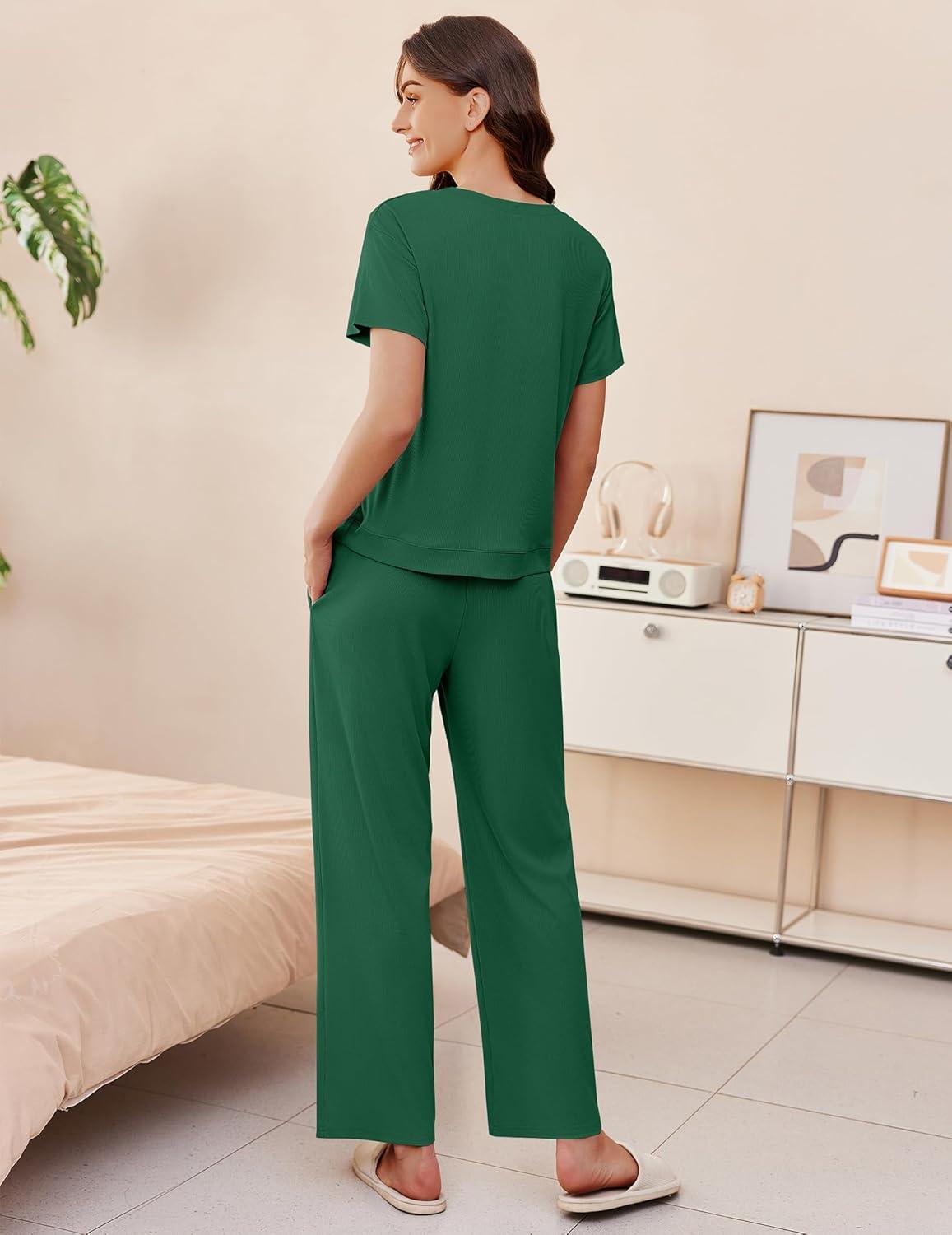 Ekouaer Womens Ribbed Knit Lounge Set Short Sleeve Top and Long Pants Soft Pajama Set 2 Piece Sleepwear with Pockets(Dark Green)