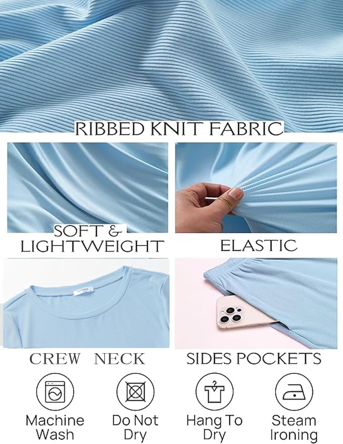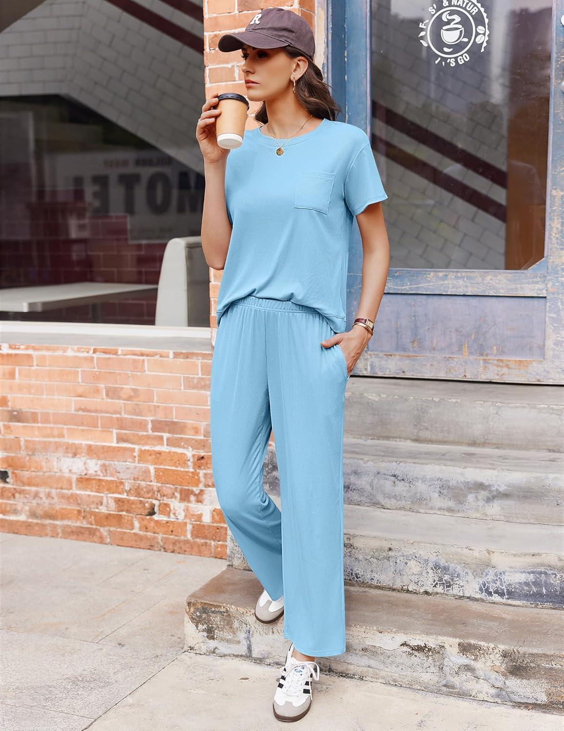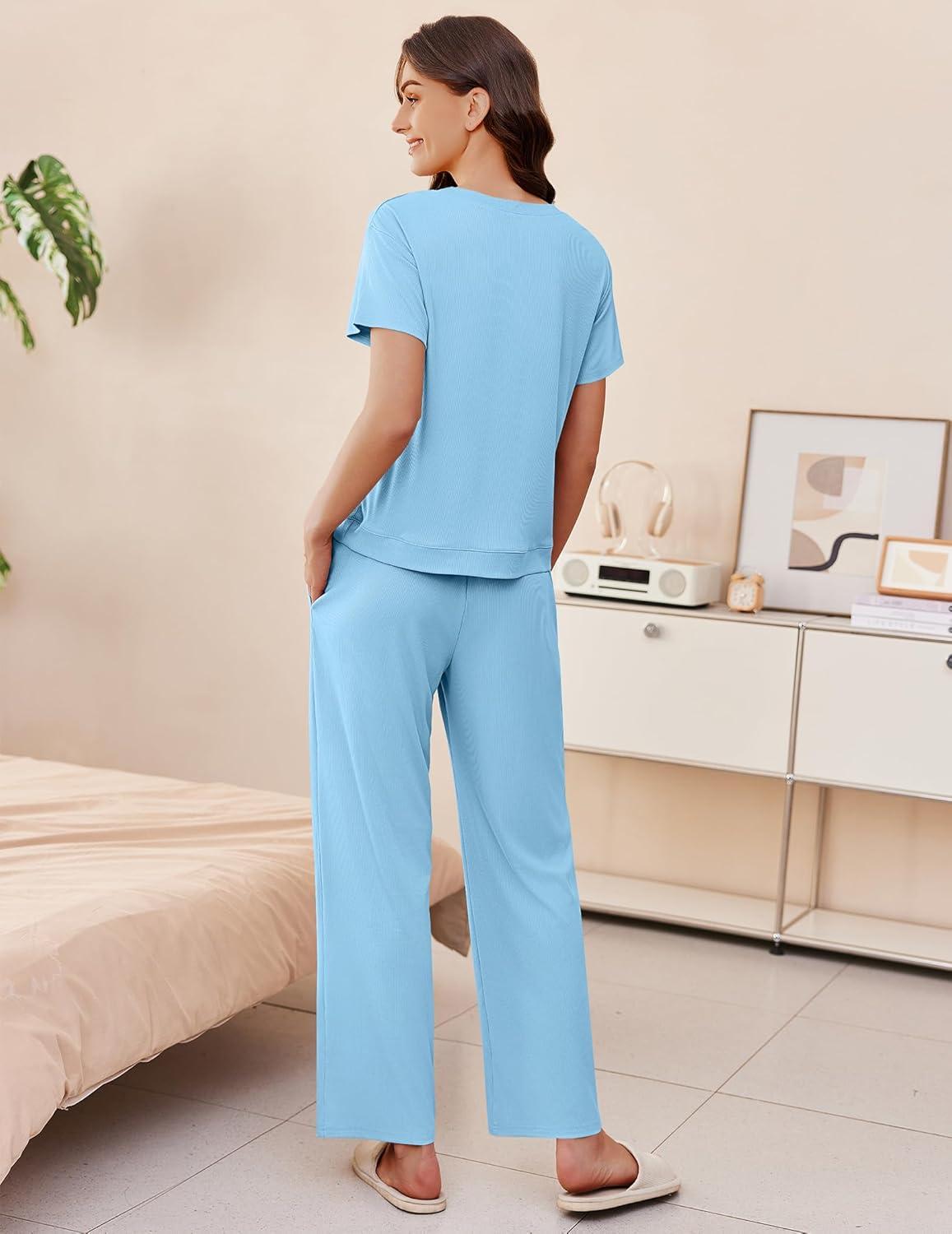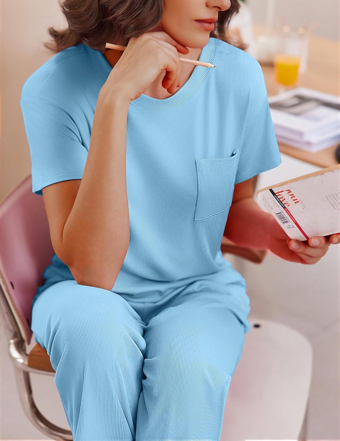 Ekouaer Womens Ribbed Knit Lounge Set Short Sleeve Top and Long Pants Soft Pajama Set 2 Piece Sleepwear with Pockets(Light Blue)