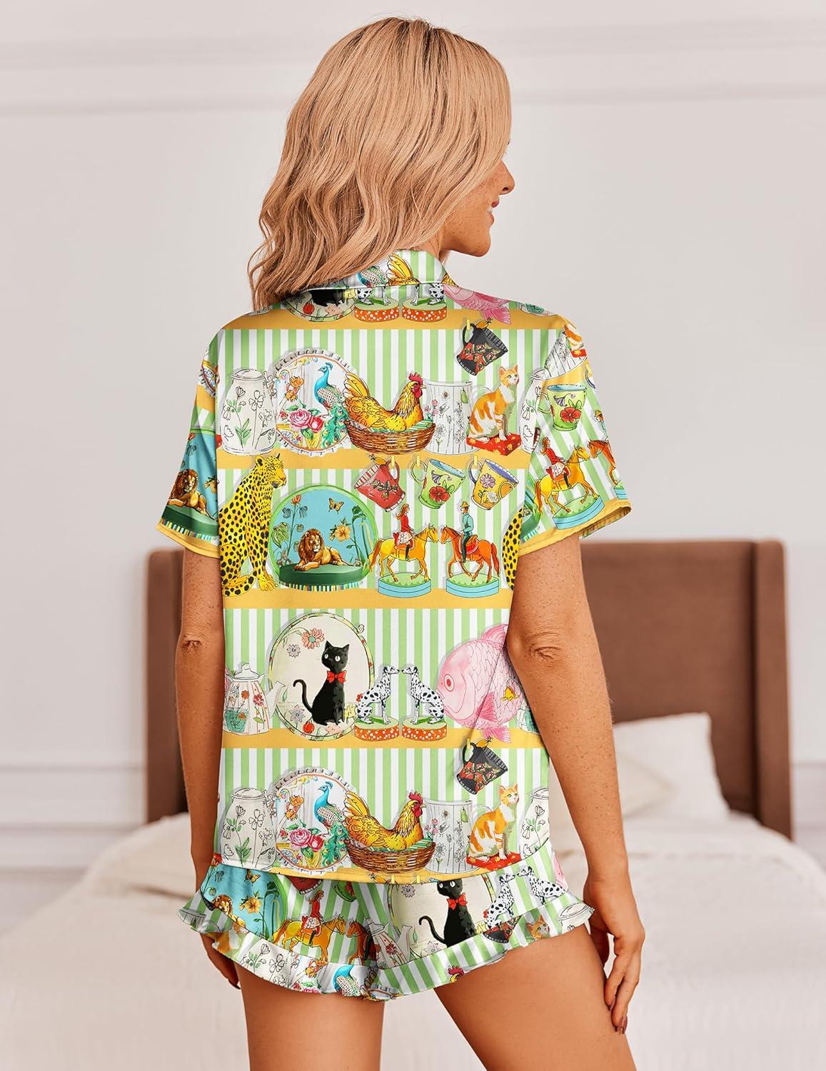 Ekouaer Womens Satin Pajamas Set Button Down 2 Piece Silk Pjs Shorts Set Ruffle Lingerie Notch Collar Sleepwear(Animal Art)