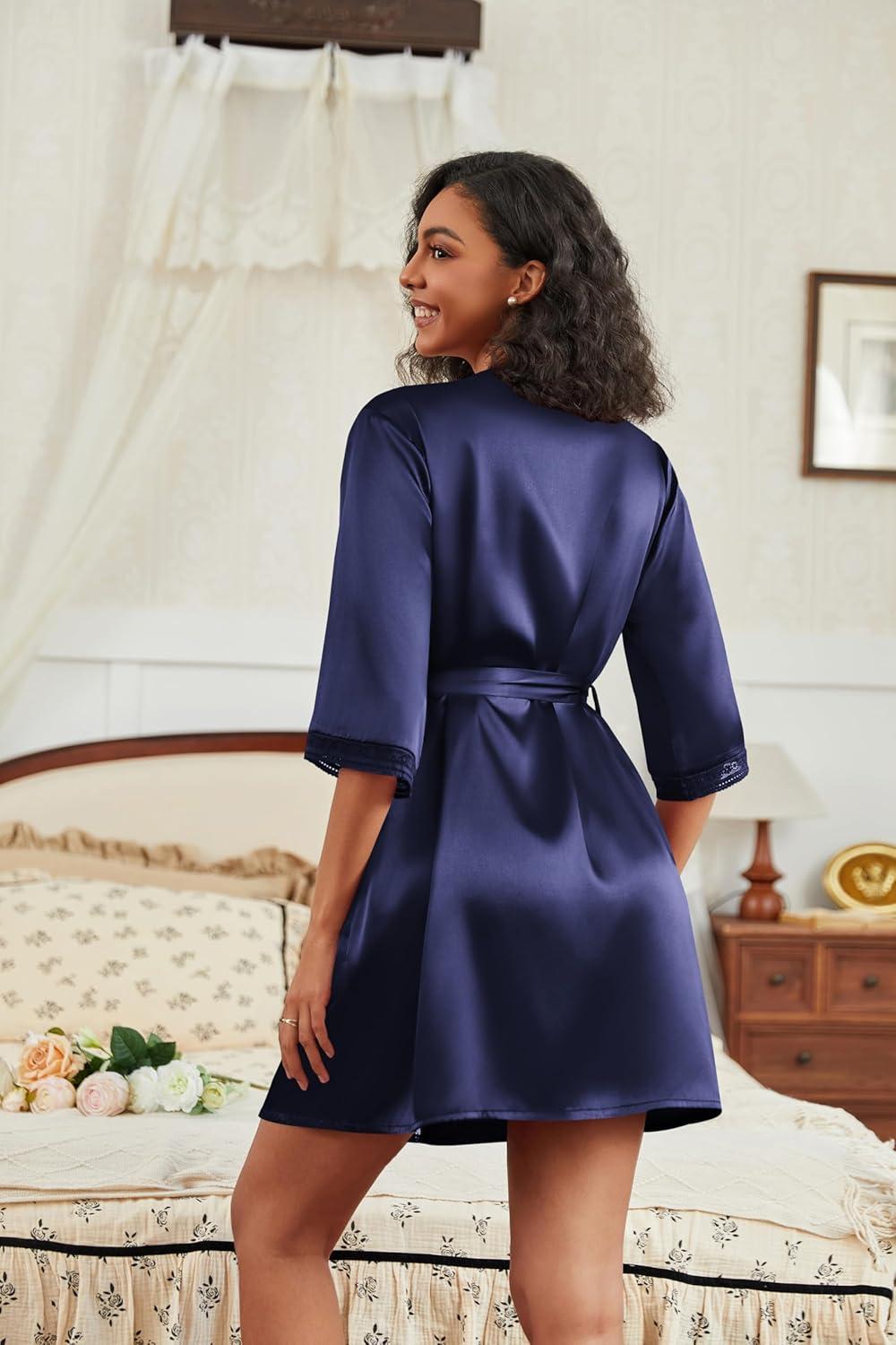 Ekouaer Women’s Satin Robes 3/4 Sleeve Silk Robes Short Kimono Sexy Bride Bathrobes Lace Trim Loungewear with Pockets(Navy Blue)