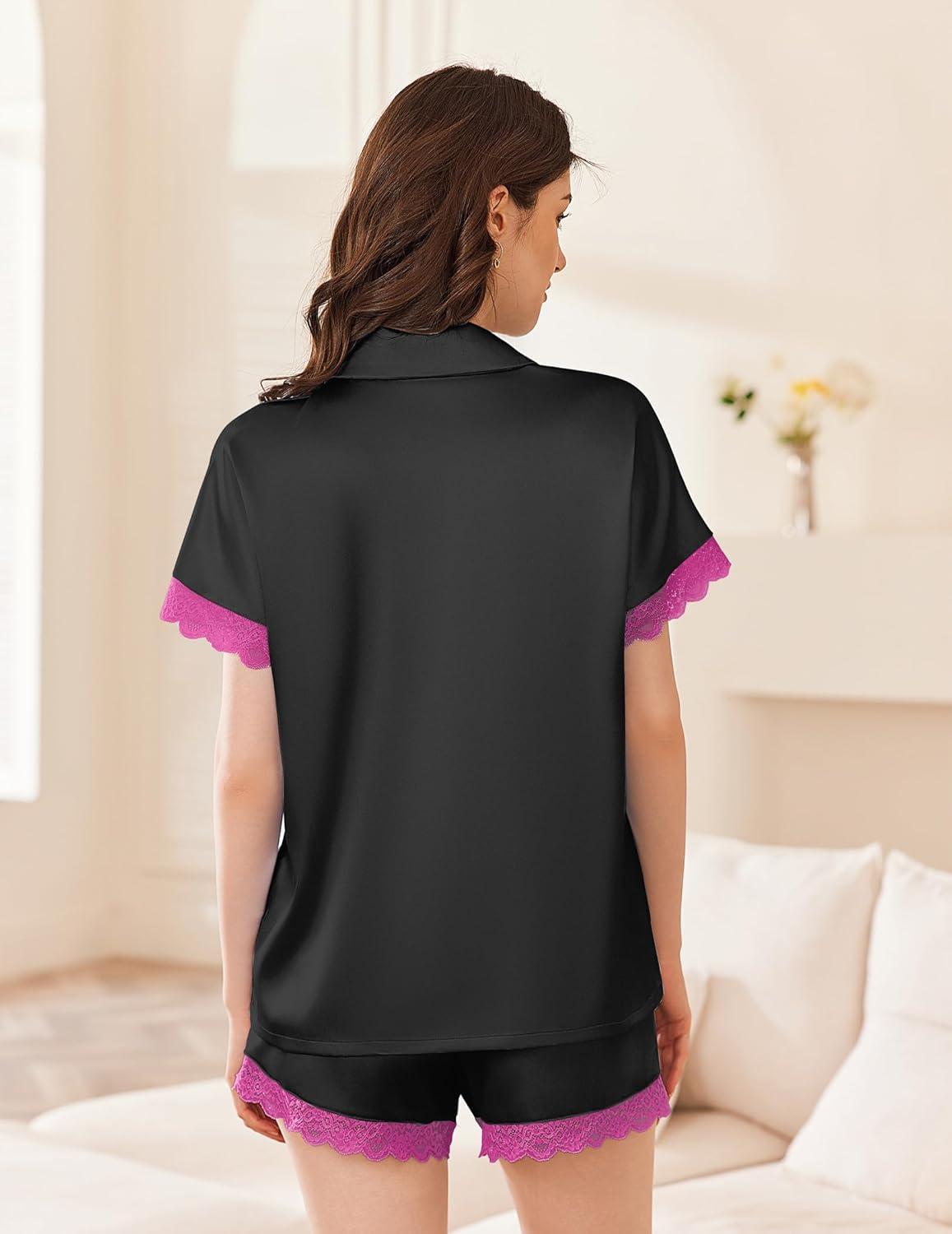 Ekouaer Womens Satin Silk Pajamas Set 2 Piece Button Down Pjs Shorts Set Short Sleeve Sleepwear Lace Trim Loungewear S-XXL(Black With Rose Red Lace Trim)