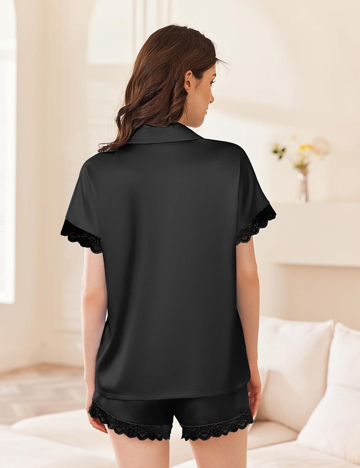 Ekouaer Womens Satin Silk Pajamas Set 2 Piece Button Down Pjs Shorts Set Short Sleeve Sleepwear Lace Trim Loungewear S-XXL(Black)