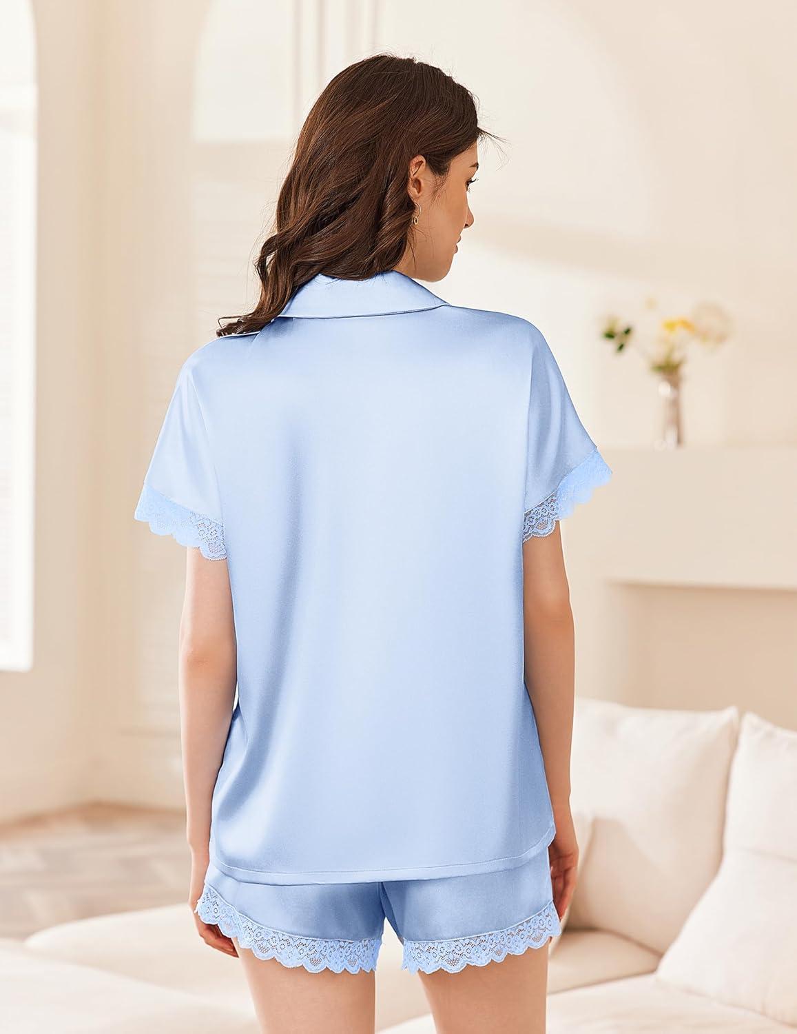 Ekouaer Womens Satin Silk Pajamas Set 2 Piece Button Down Pjs Shorts Set Short Sleeve Sleepwear Lace Trim Loungewear S-XXL(Light Blue)