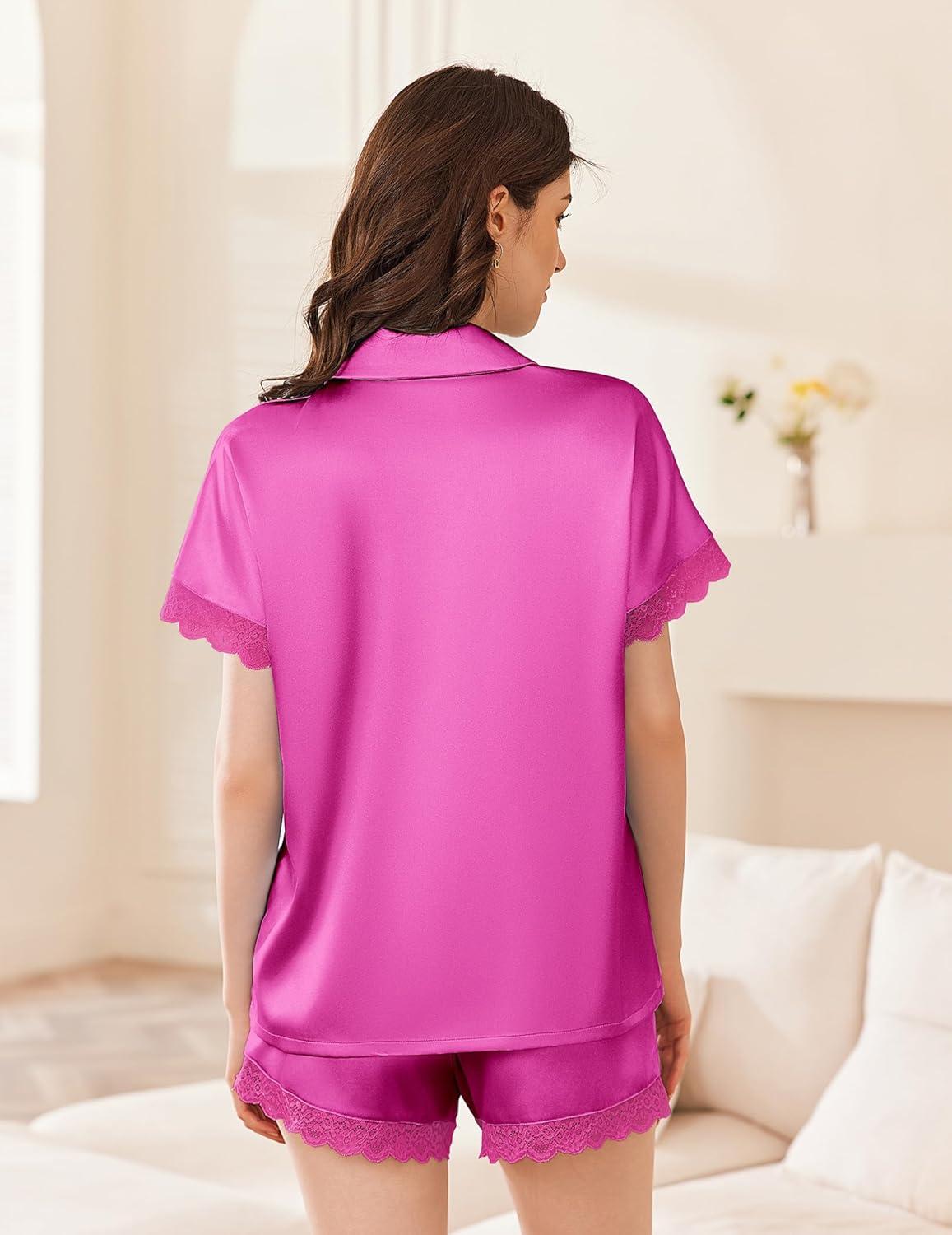 Ekouaer Womens Satin Silk Pajamas Set 2 Piece Button Down Pjs Shorts Set Short Sleeve Sleepwear Lace Trim Loungewear S-XXL(Rose Red)