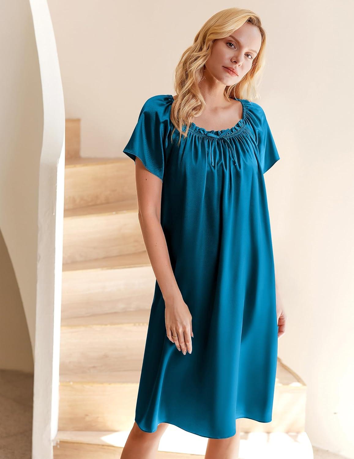 Ekouaer Women's Satin Silk Pleated Nightgown Loose Sleepwear Printed Nightshirt Short Sleeve Sleep Dress(Deep Blue)