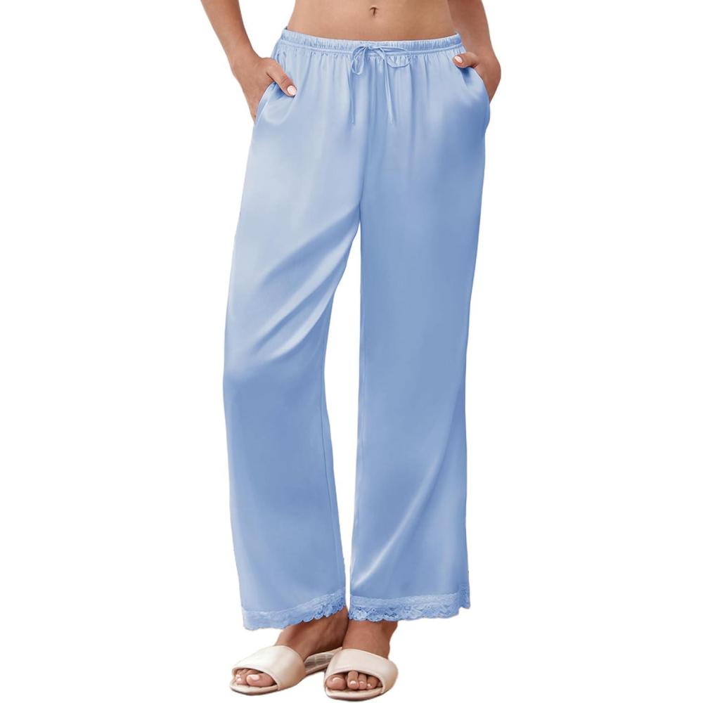 Ekouaer Womens Silk Satin Pajama Pants Casual Comfy Sleep Pants Pocketed Elastic Waist Wide Leg Pj Bottoms with Lace Trim(Light Blue)