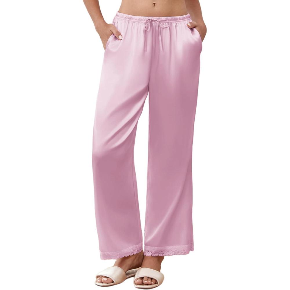 Ekouaer Womens Silk Satin Pajama Pants Casual Comfy Sleep Pants Pocketed Elastic Waist Wide Leg Pj Bottoms with Lace Trim(Pink)