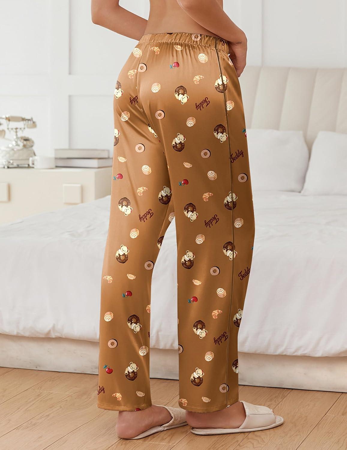 Ekouaer Womens Silk Satin Pajama Pants Soft Comfy Loose Pj Pants Drawstring Elastic Waist Wide Leg Lounge Bottom with Pockets(Brown Teddy)