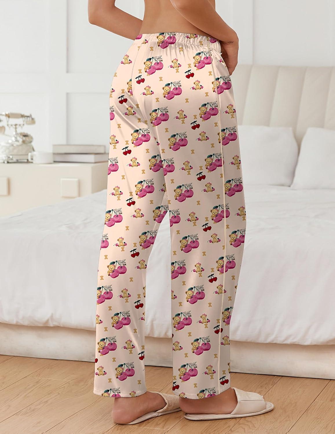 Ekouaer Womens Silk Satin Pajama Pants Soft Comfy Loose Pj Pants Drawstring Elastic Waist Wide Leg Lounge Bottom with Pockets(Khaki Cherry Teddy)
