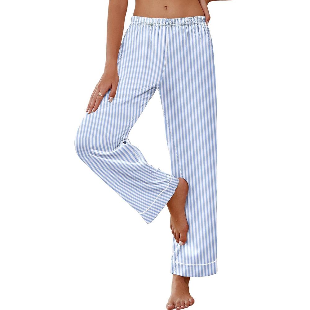 Ekouaer Womens Silk Satin Pajama Pants Soft Loose Lounge Pants Lightweight Elastic Waist Wide Leg Pj Bottoms with Pockets(Blue Stripes)