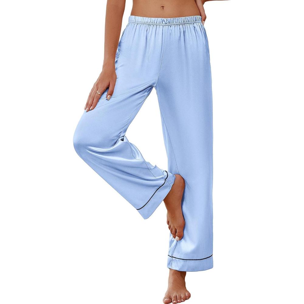Ekouaer Womens Silk Satin Pajama Pants Soft Loose Lounge Pants Lightweight Elastic Waist Wide Leg Pj Bottoms with Pockets(Light Blue)