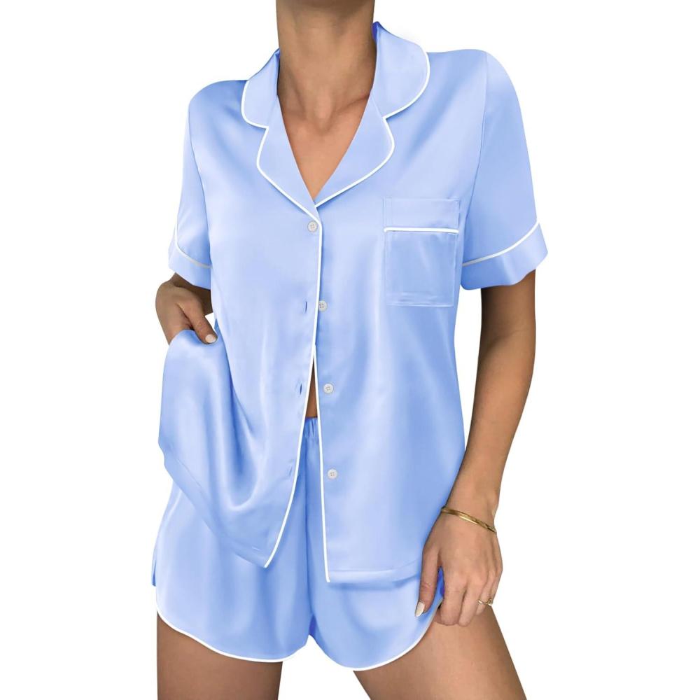 Ekouaer Womens Silk Satin Pajama Sets 2 Piece Button Down Silk Pjs Shorts Sets Short Sleeve Loungewear Soft Sleepwear S-XXL(Light Blue)