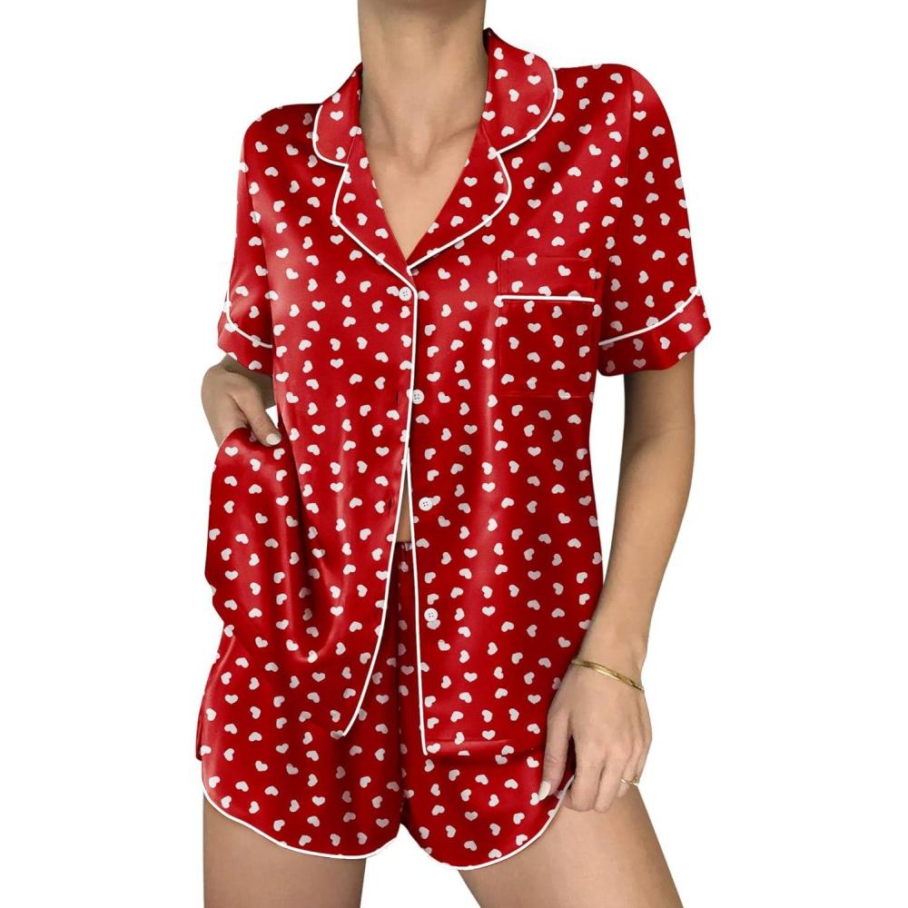 Ekouaer Womens Silk Satin Pajama Sets 2 Piece Button Down Silk Pjs Shorts Sets Short Sleeve Loungewear Soft Sleepwear S-XXL(White Heart Print)