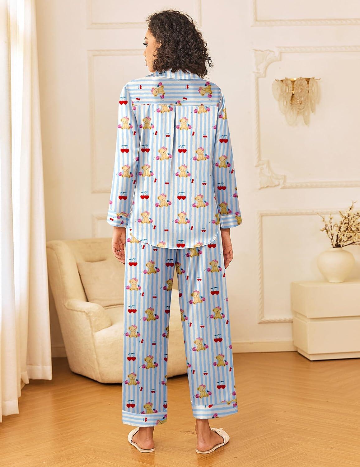 Ekouaer Womens Silk Satin Pajama Sets 2 Piece Sleepwear Pjs Set Long Sleeve Button Down Top and Pants Stripe Loungewear S-XXL(Blue Striped Teddy)