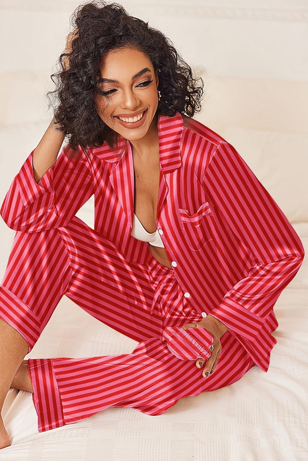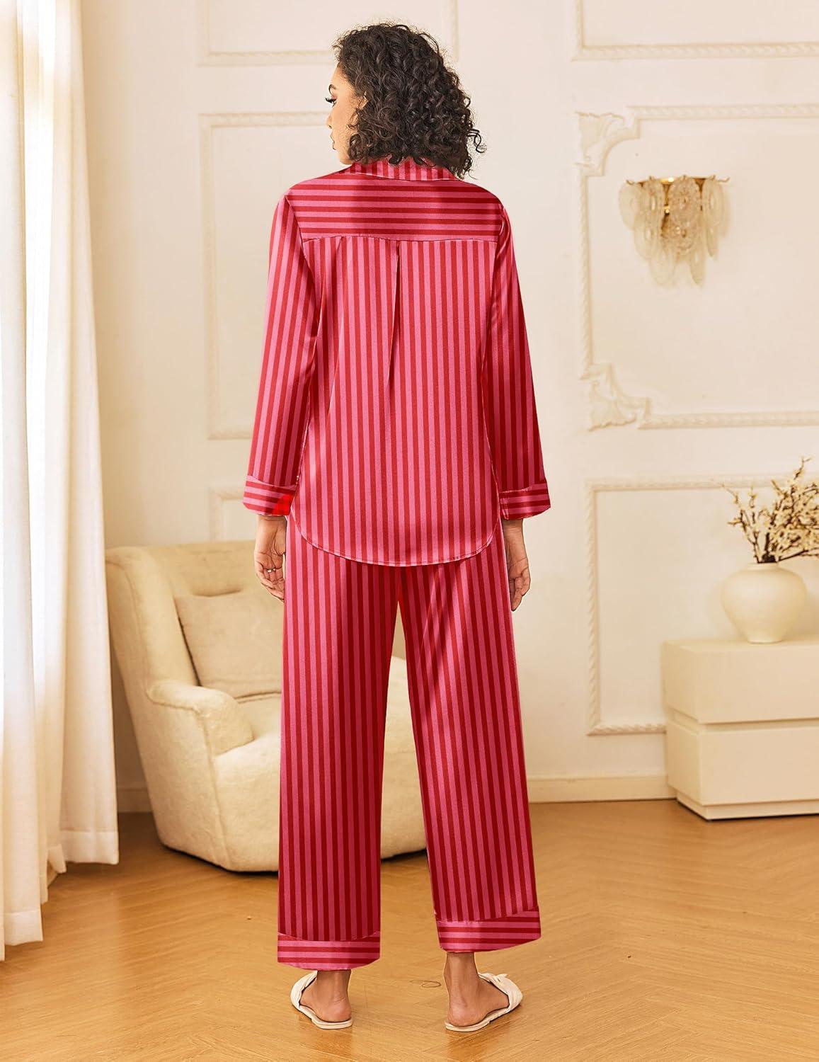 Ekouaer Womens Silk Satin Pajama Sets 2 Piece Sleepwear Pjs Set Long Sleeve Button Down Top and Pants Stripe Loungewear S-XXL(Rose Red Stripe)