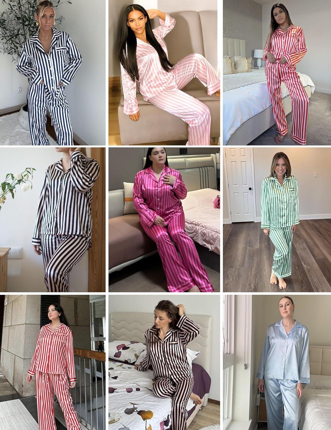 Ekouaer Womens Silk Satin Pajama Sets 2 Piece Sleepwear Pjs Set Long Sleeve Button Down Top and Pants Stripe Loungewear S-XXL(Red Stripe)