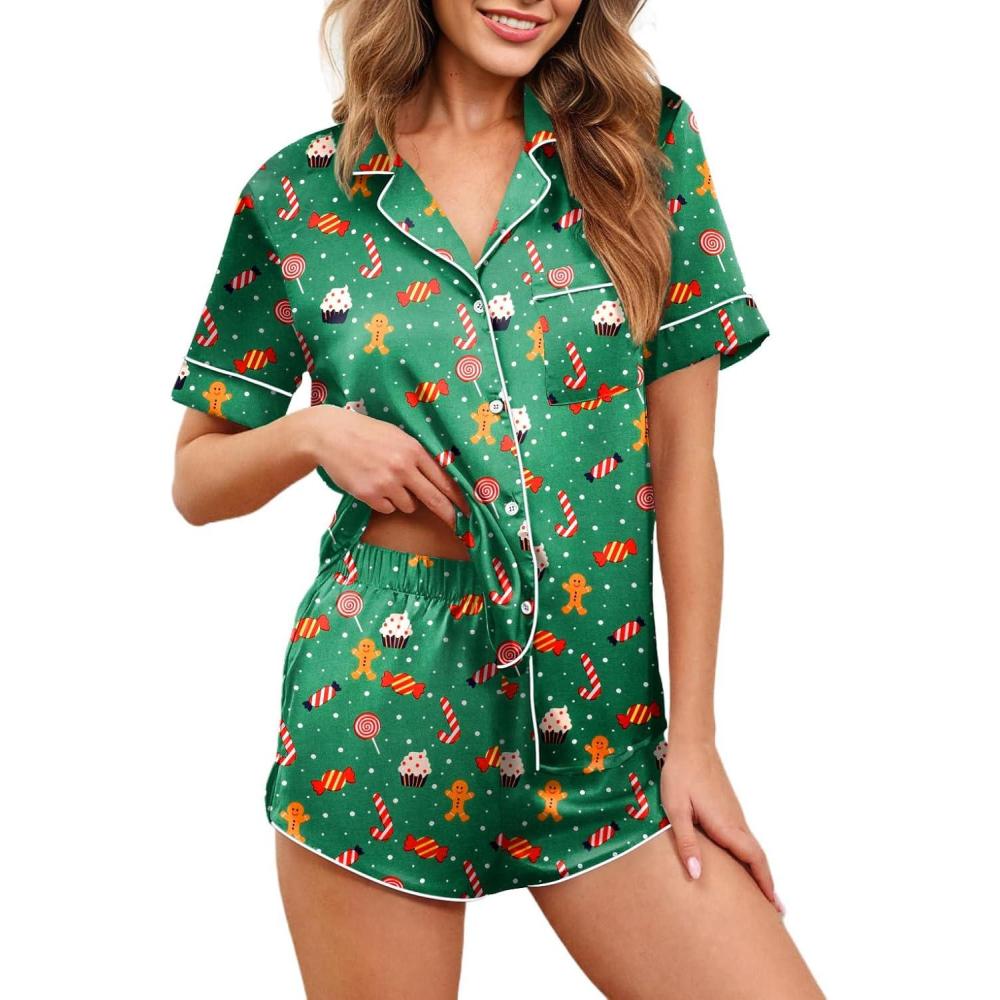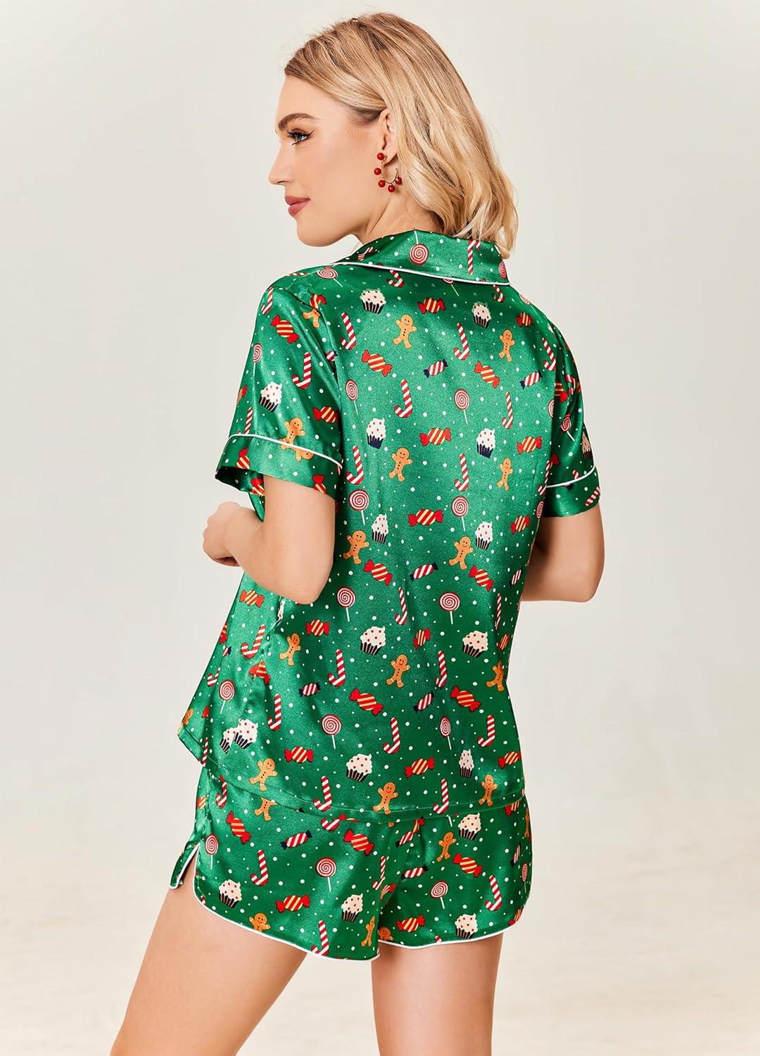 Ekouaer Womens Silk Satin Pajamas Set Short Sleeve Sleepwear Button Down Loungewear 2 Piece Pjs Shorts Set S-5X Plus Size(Green Christmas Print)