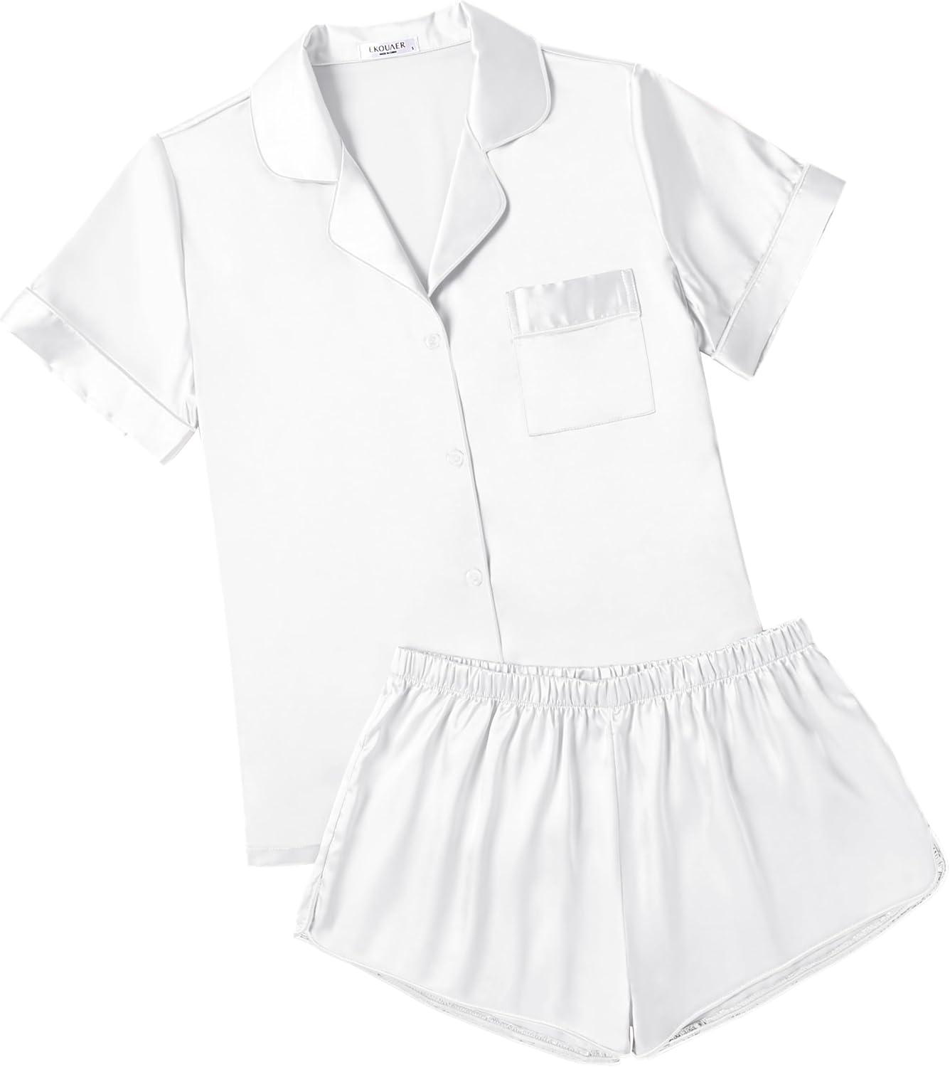 Ekouaer Womens Silk Satin Pajamas Set Short Sleeve Sleepwear Button Down Loungewear 2 Piece Pjs Shorts Set S-5X Plus Size(White With White Piping)