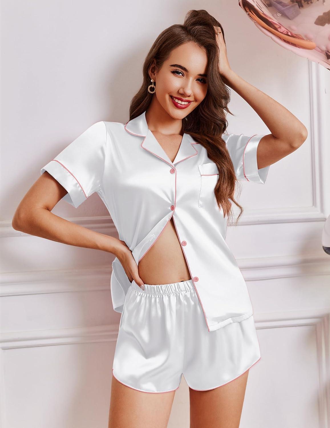 Ekouaer Womens Silk Satin Pajamas Short Sleeve Sleepwear Soft Button Down Loungewear 2 Piece PJS Shorts Set S-XXL(White With Pink Piping)