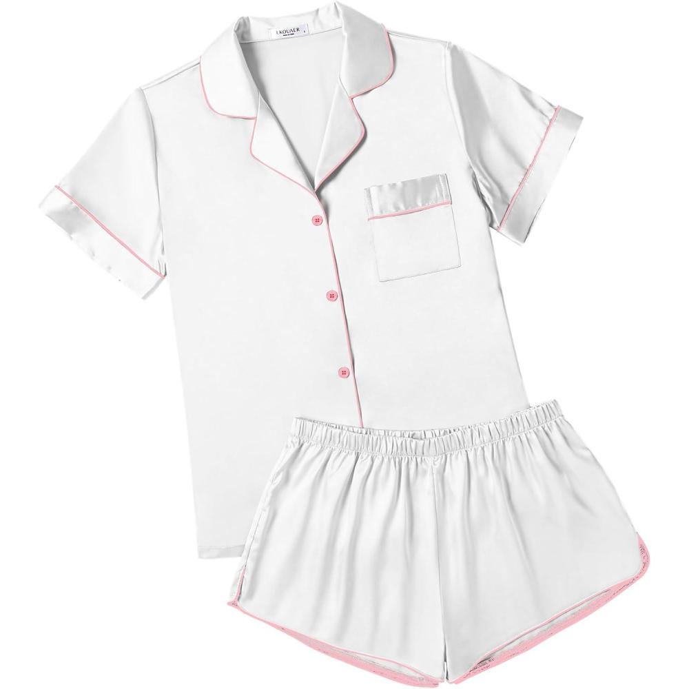 imageEkouaer Womens Silk Satin Pajamas Short Sleeve Sleepwear Soft Button Down Loungewear 2 Piece PJS Shorts Set SXXLWhite With Pink Piping