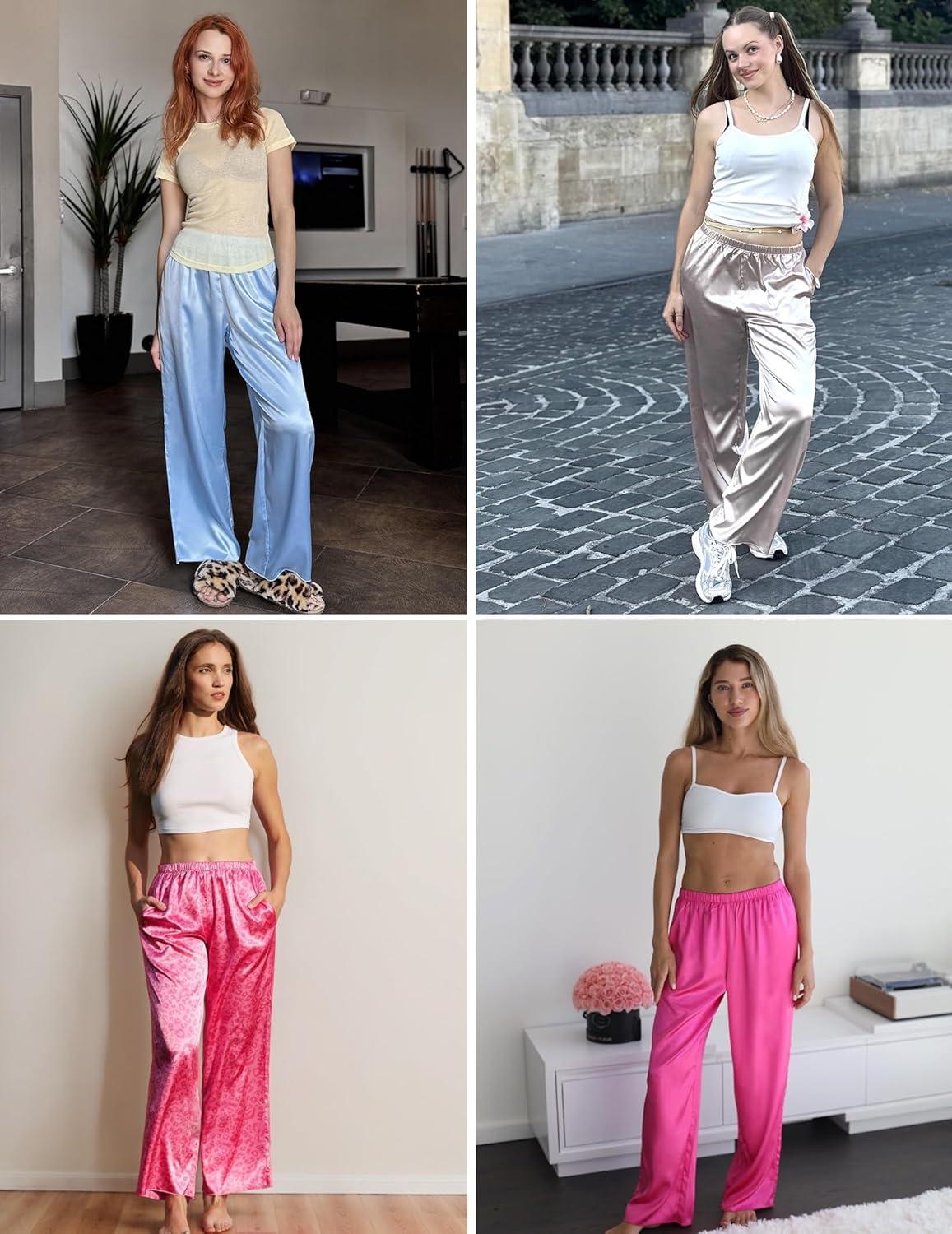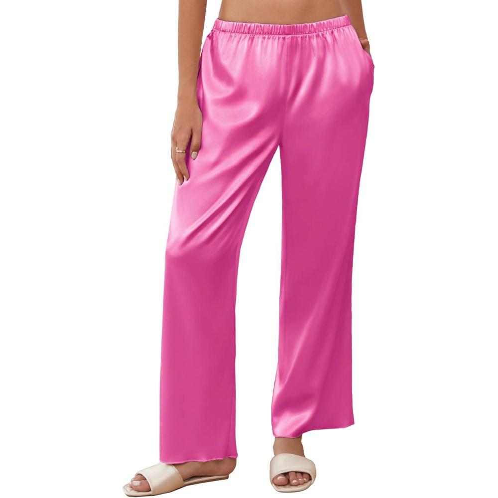 imageEkouaer Womens Silk Satin Wide Leg Pajama Sleep Pants Casual Loose Soft Lounge Pants Elastic Waist Pj Bottoms with PocketsRose Red