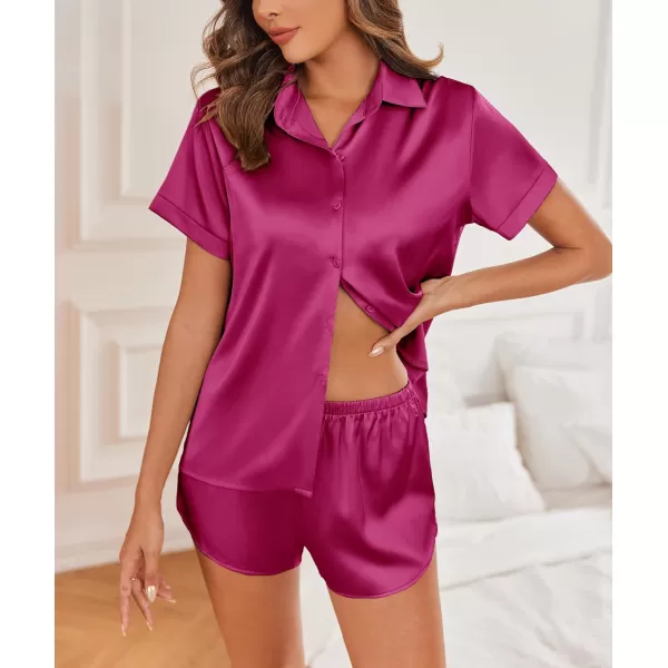 Ekouaer Women's Silk Short Sleeve Button-Down Pajama Sets(Rose Red)