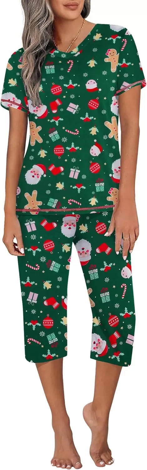 imageEkouaer Womens Sleepwear Capri Pajama Sets Short Sleeve TwoPiece Pjs V Neck Tops ampamp Capri Pants with Pockets S3XLChristmas Trees