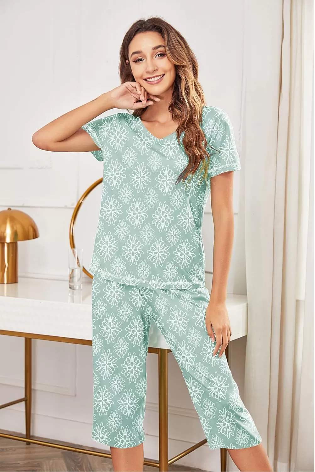 Ekouaer Women's Sleepwear Capri Pajama Sets Short Sleeve Two-Piece Pjs V Neck Tops & Capri Pants with Pockets S-3XL(Light Green Flowers)