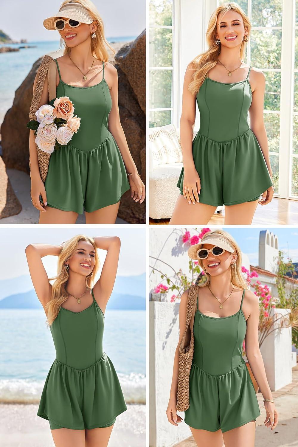 Ekouaer Womens Summer Sleeveless Workout Rompers Athletic Jumpsuit Double Lined Shorts One Piece Gym Yoga Clothes XS-XL(Dark Green)
