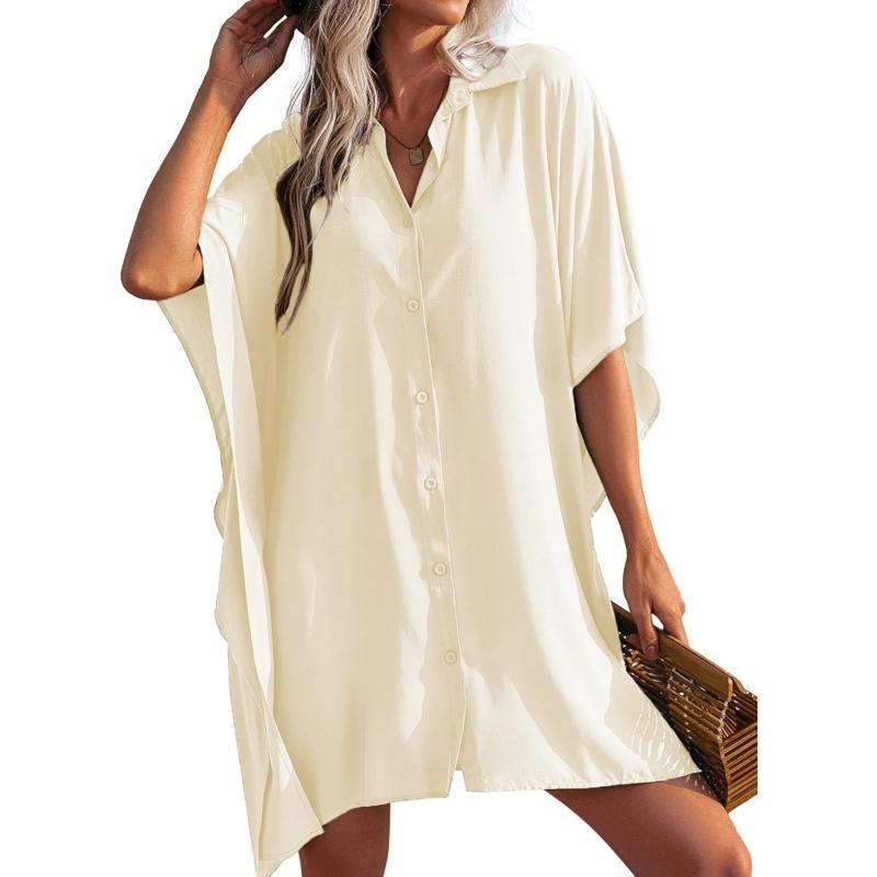 Ekouaer Womens Swimsuit Cover Up 34 Sleeve Beachwear Bikini Coverups Button Down Oversized Cover Up Shirt S3XLBeige