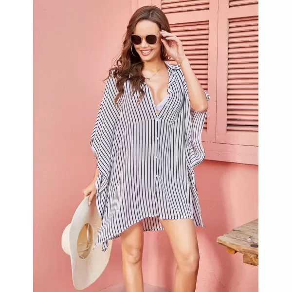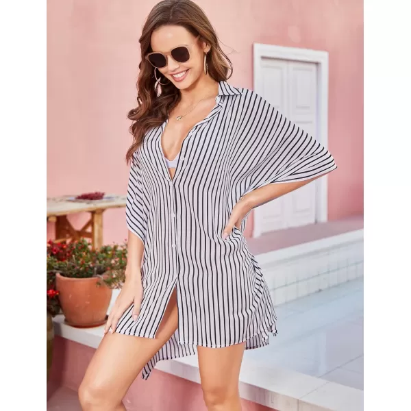 Ekouaer Womens Swimsuit Cover Up 34 Sleeve Beachwear Bikini Coverups Button Down Oversized Cover Up Shirt S3XLWhite Stripe