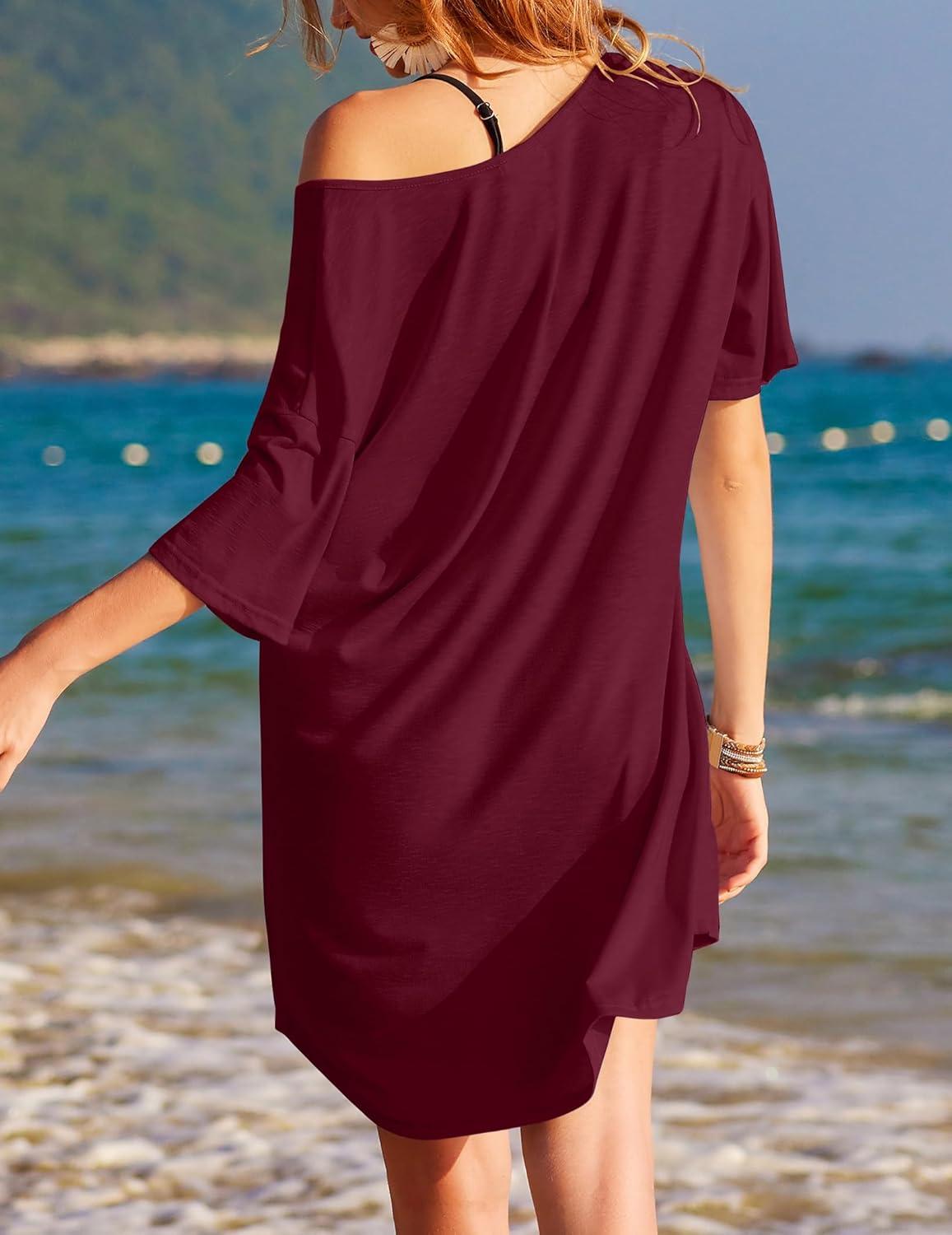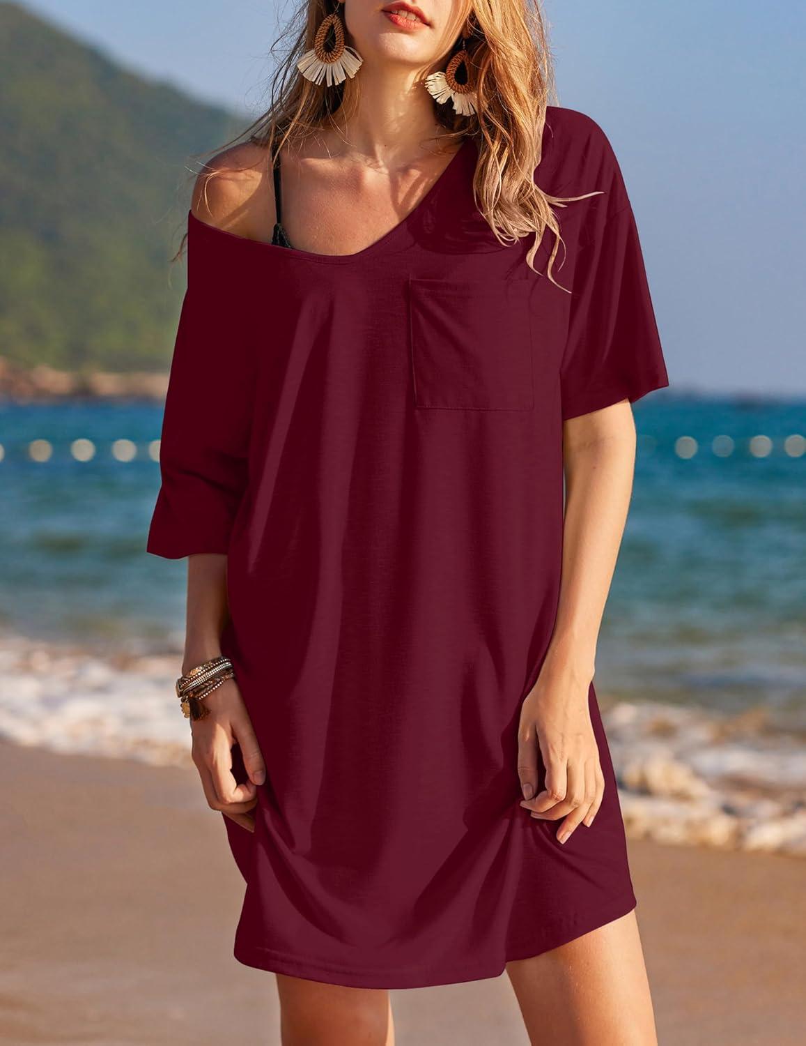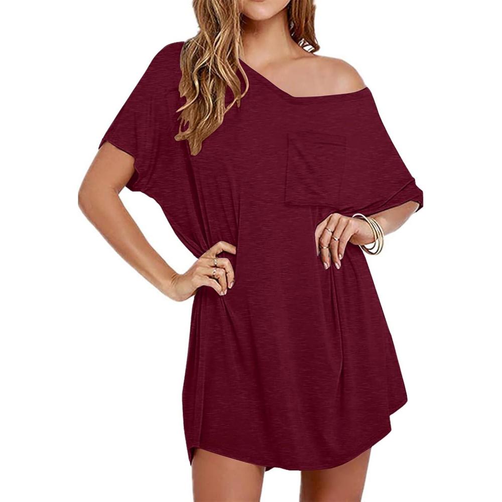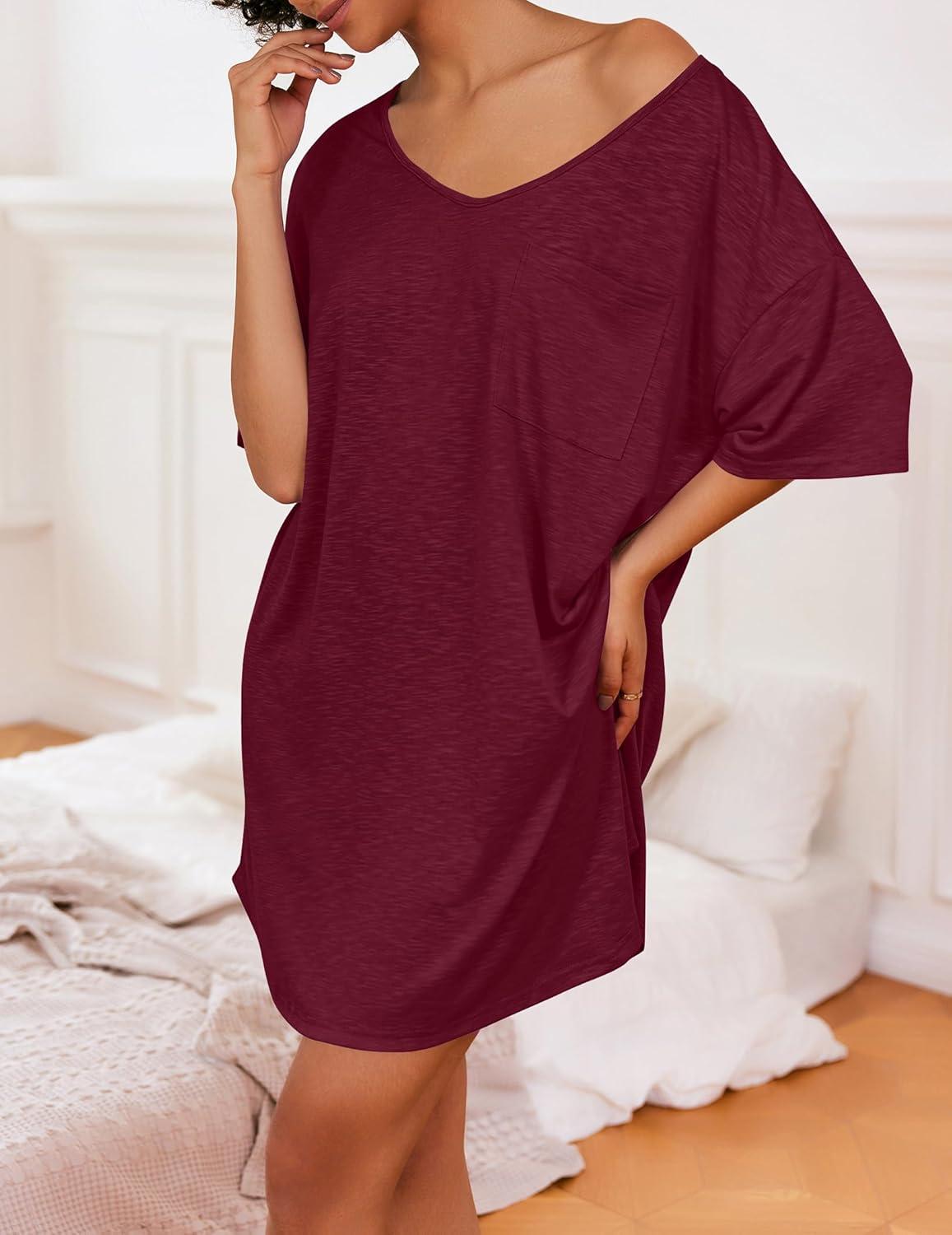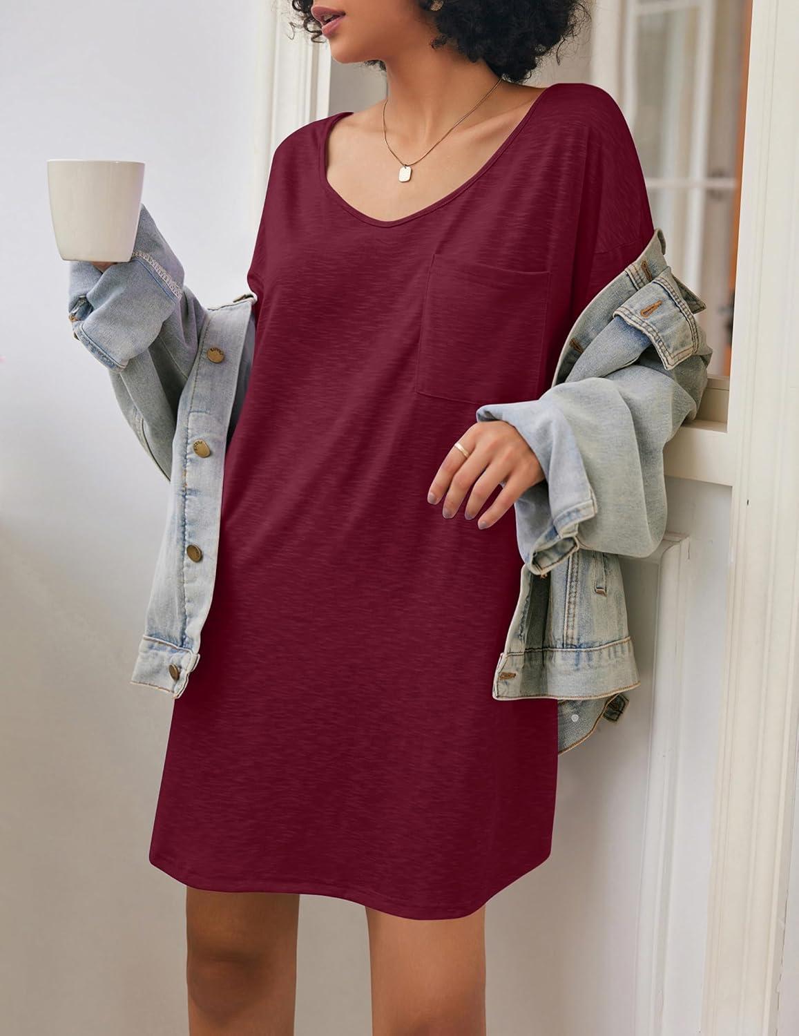 Ekouaer Womens Tshirt Nightgown Cotton V Neck Sleepshirts Comfy Casual Nightshirt for Women(Wine Red)