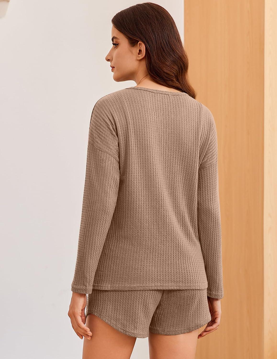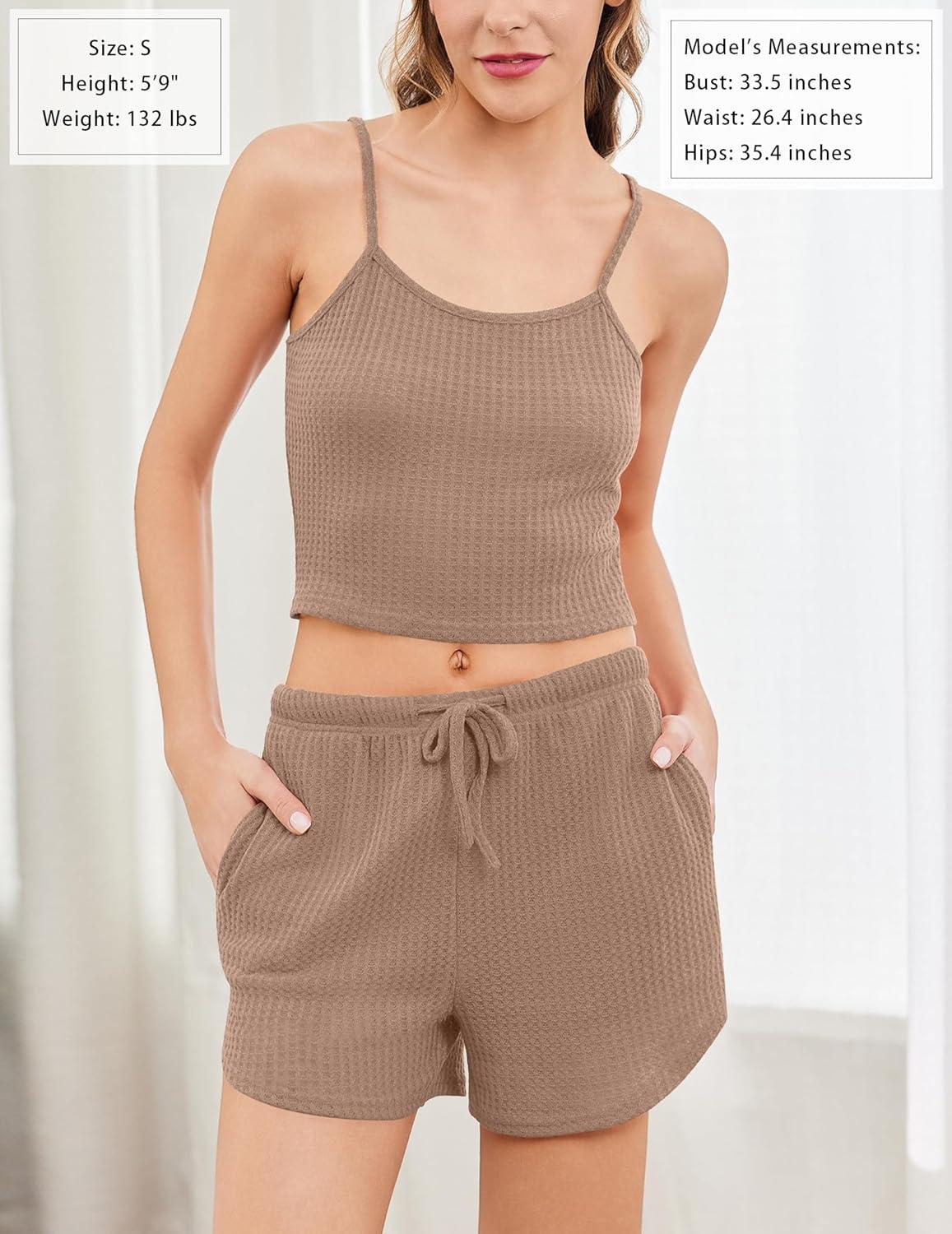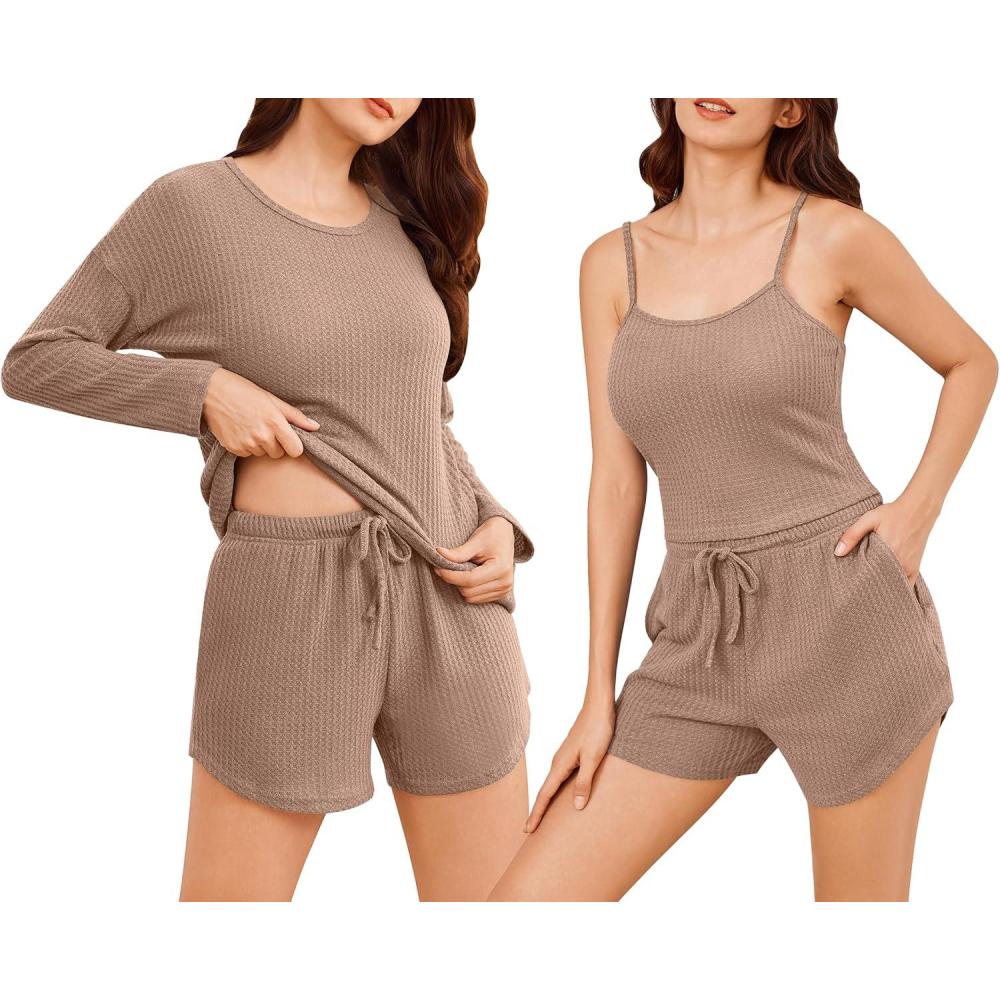 Ekouaer Womens Waffle Knit Pajama Sets 3 Piece Long Sleeve and Cami Top with Shorts Outfits Lounge Set(Khaki)