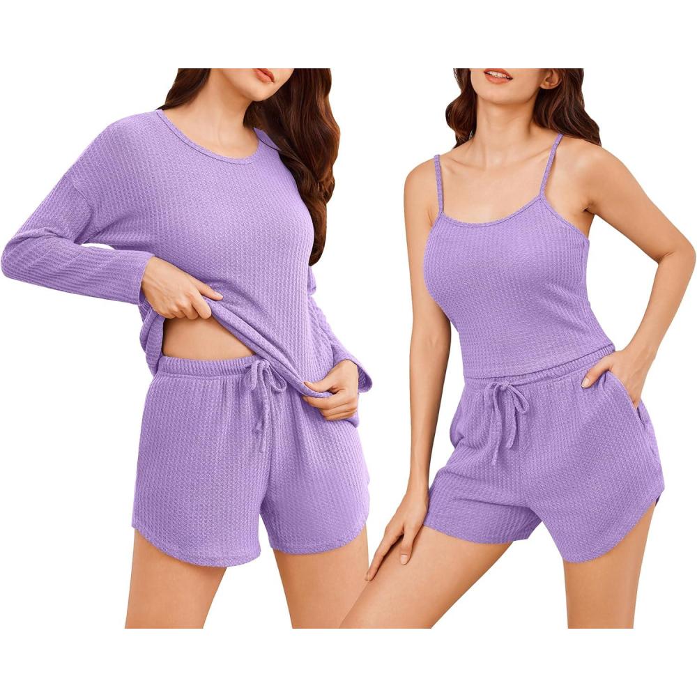 Ekouaer Womens Waffle Knit Pajama Sets 3 Piece Long Sleeve and Cami Top with Shorts Outfits Lounge Set(Light Purple)