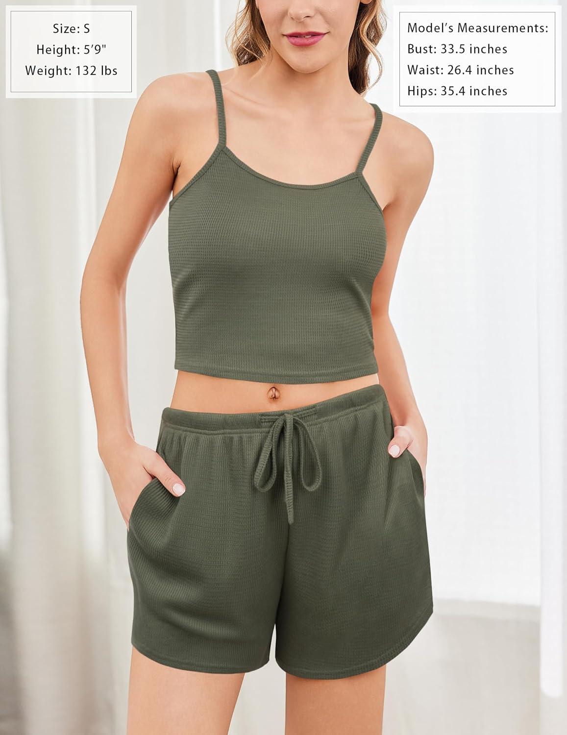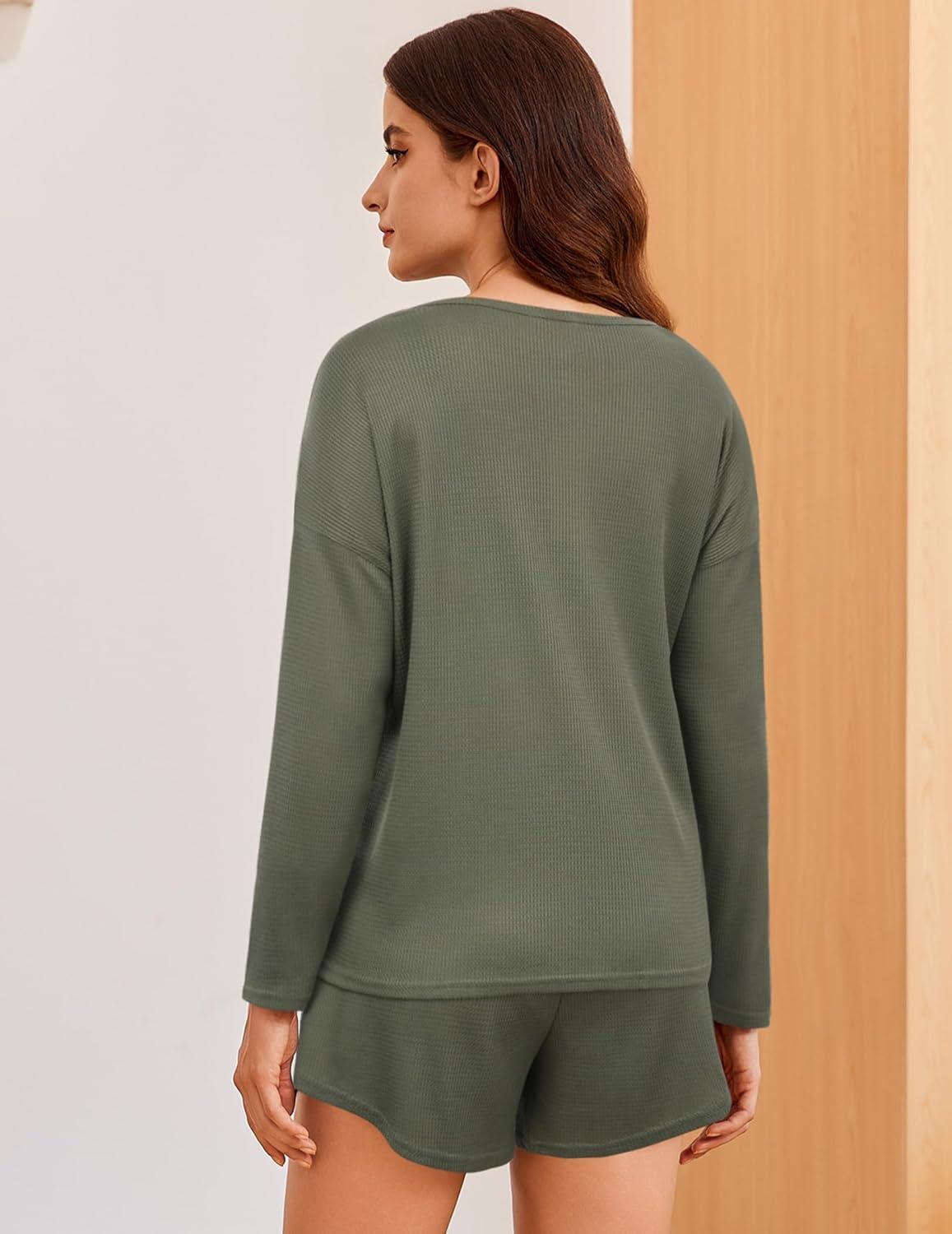 Ekouaer Womens Waffle Knit Pajama Sets 3 Piece Long Sleeve and Cami Top with Shorts Outfits Lounge Set(Sage Green)