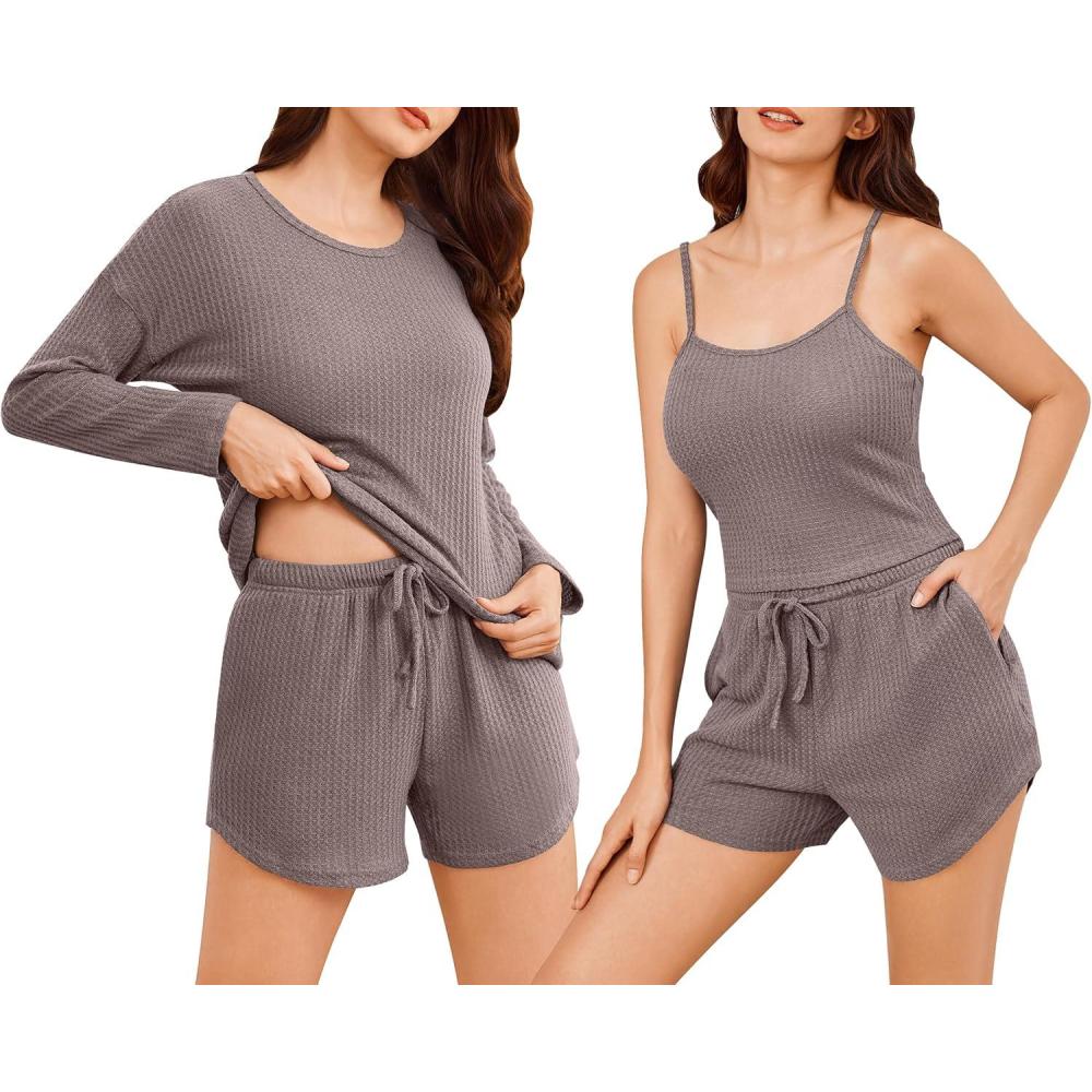Ekouaer Womens Waffle Knit Pajama Sets 3 Piece Long Sleeve and Cami Top with Shorts Outfits Lounge Set(Taupe Gray)