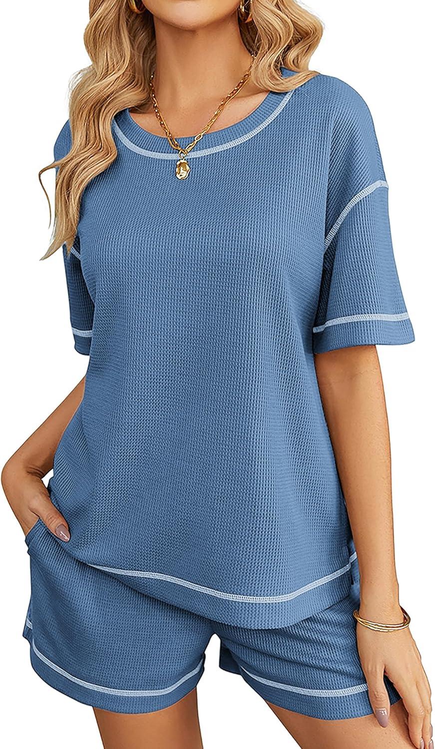 Ekouaer Women's Waffle Knit Two Piece Lounge Set, Soft Matching Outfits for Daily Wear, Casual Shorts Set with Pocket(Blue)