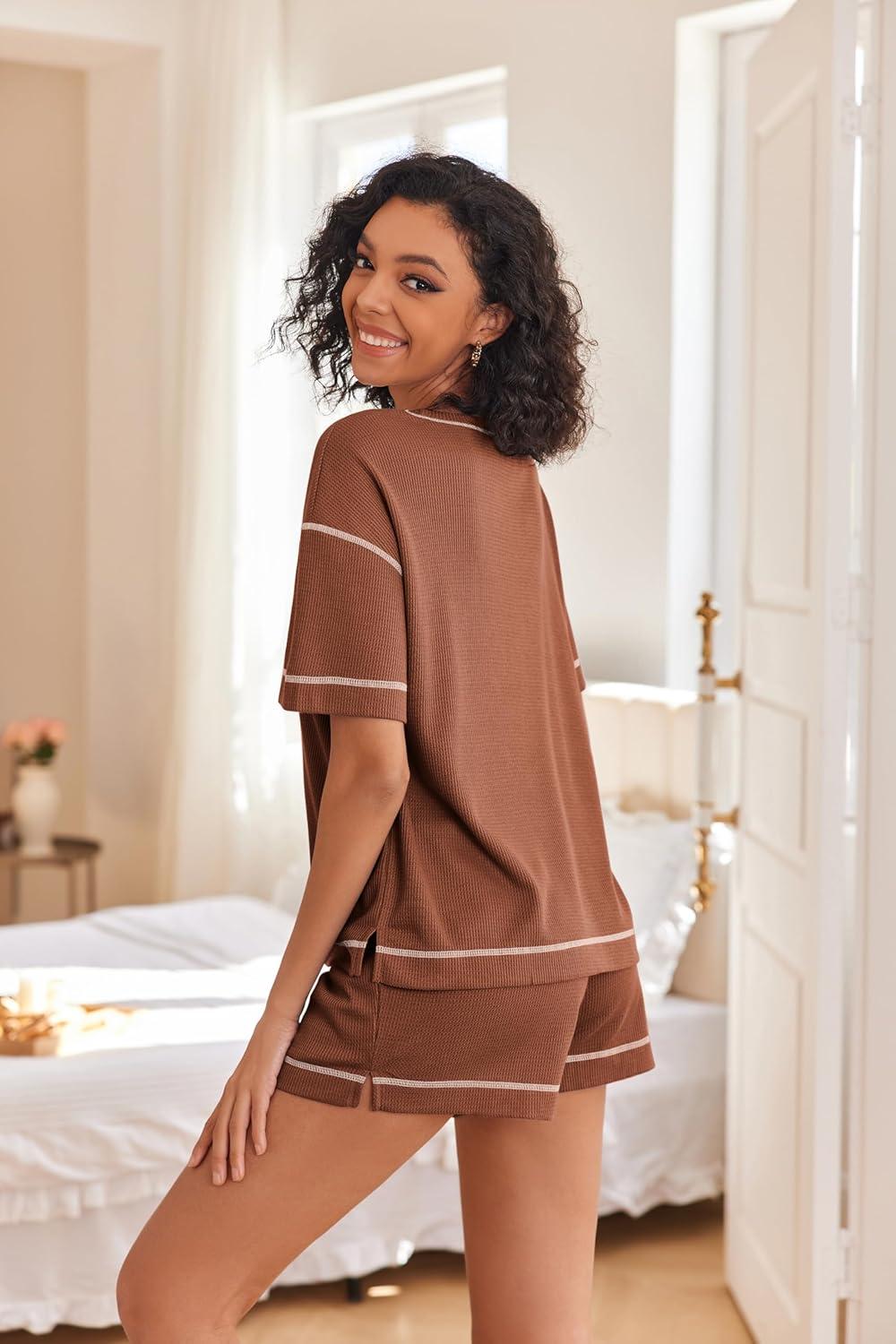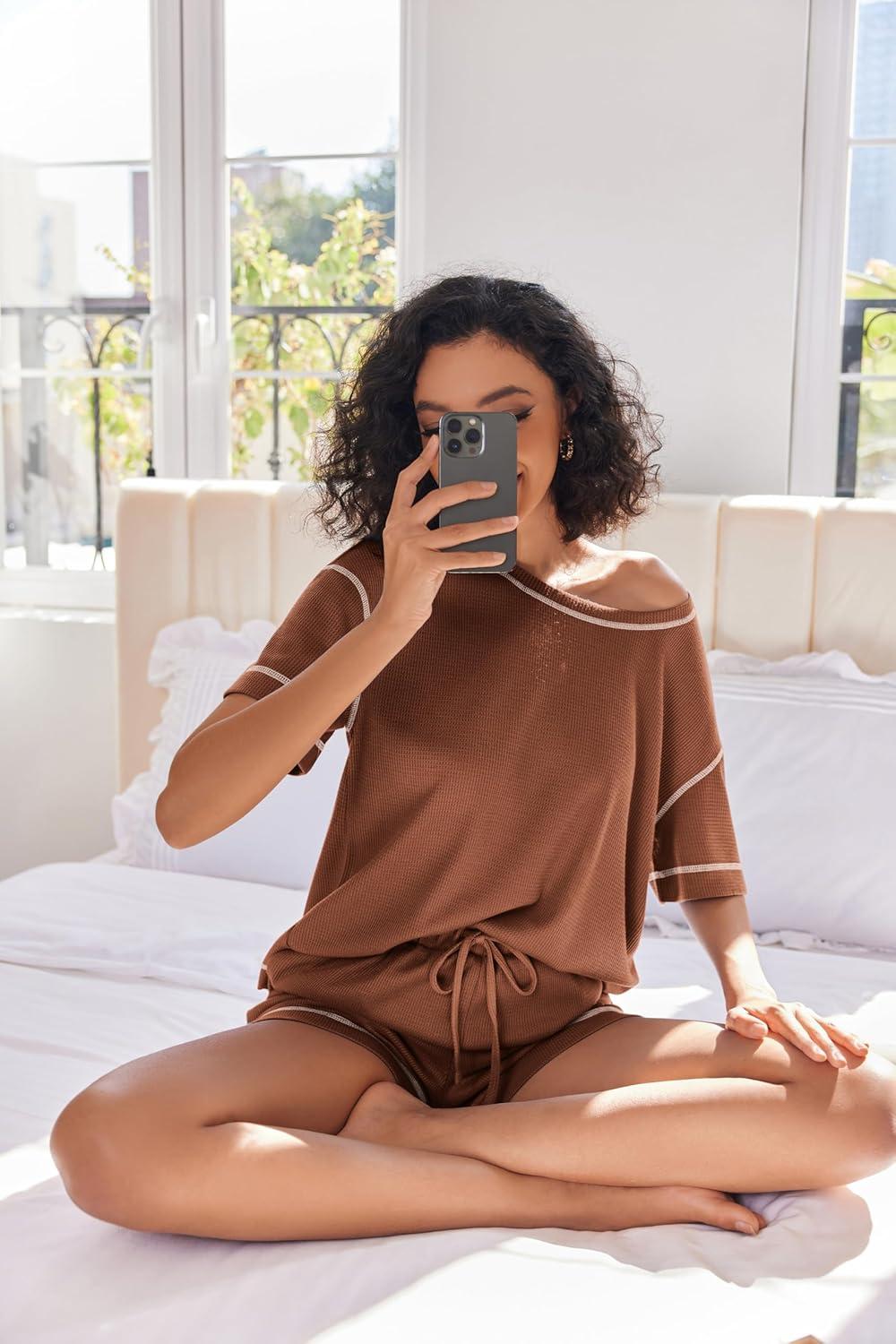 Ekouaer Women’s Waffle Knit Two Piece Lounge Set, Soft Matching Outfits for Daily Wear, Casual Shorts Set with Pocket(Caramel Colour)