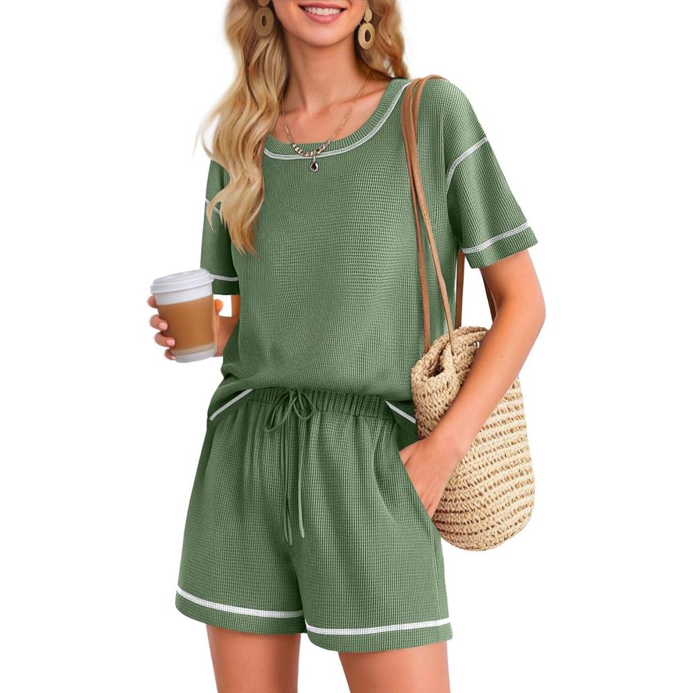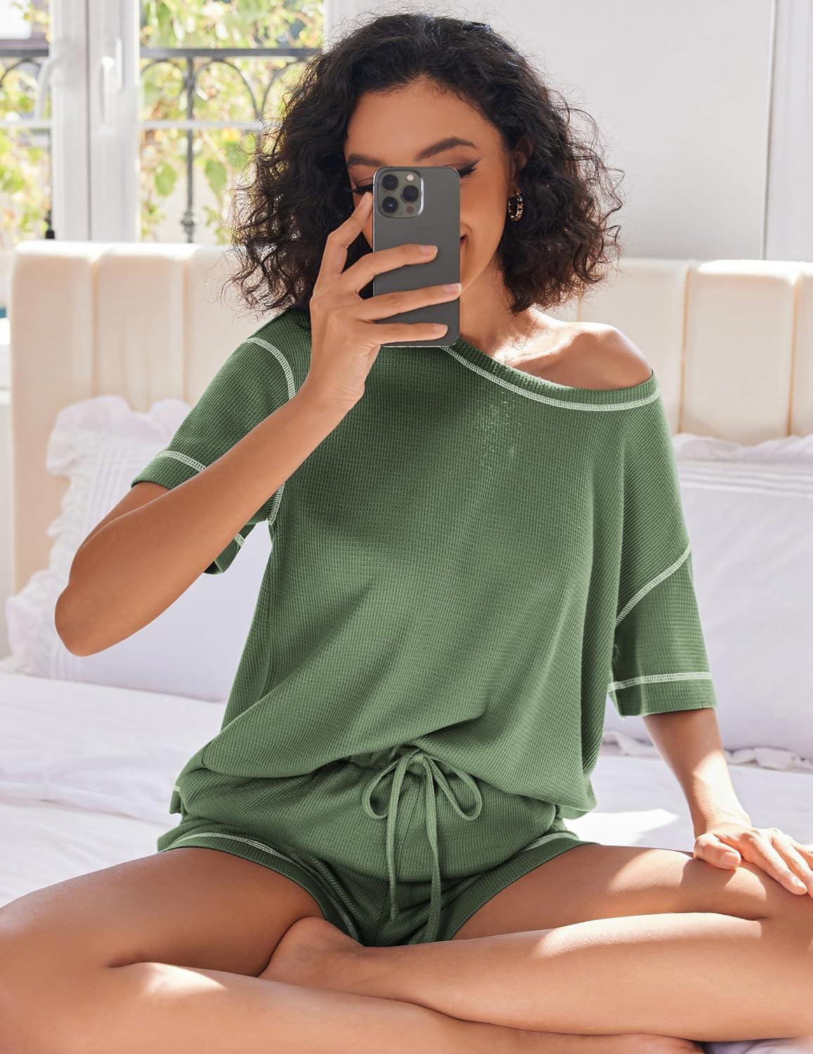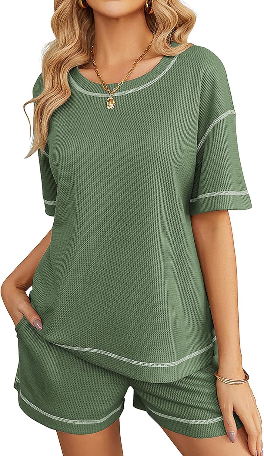 Ekouaer Women's Waffle Knit Two Piece Lounge Set, Soft Matching Outfits for Daily Wear, Casual Shorts Set with Pocket(Dark Green)